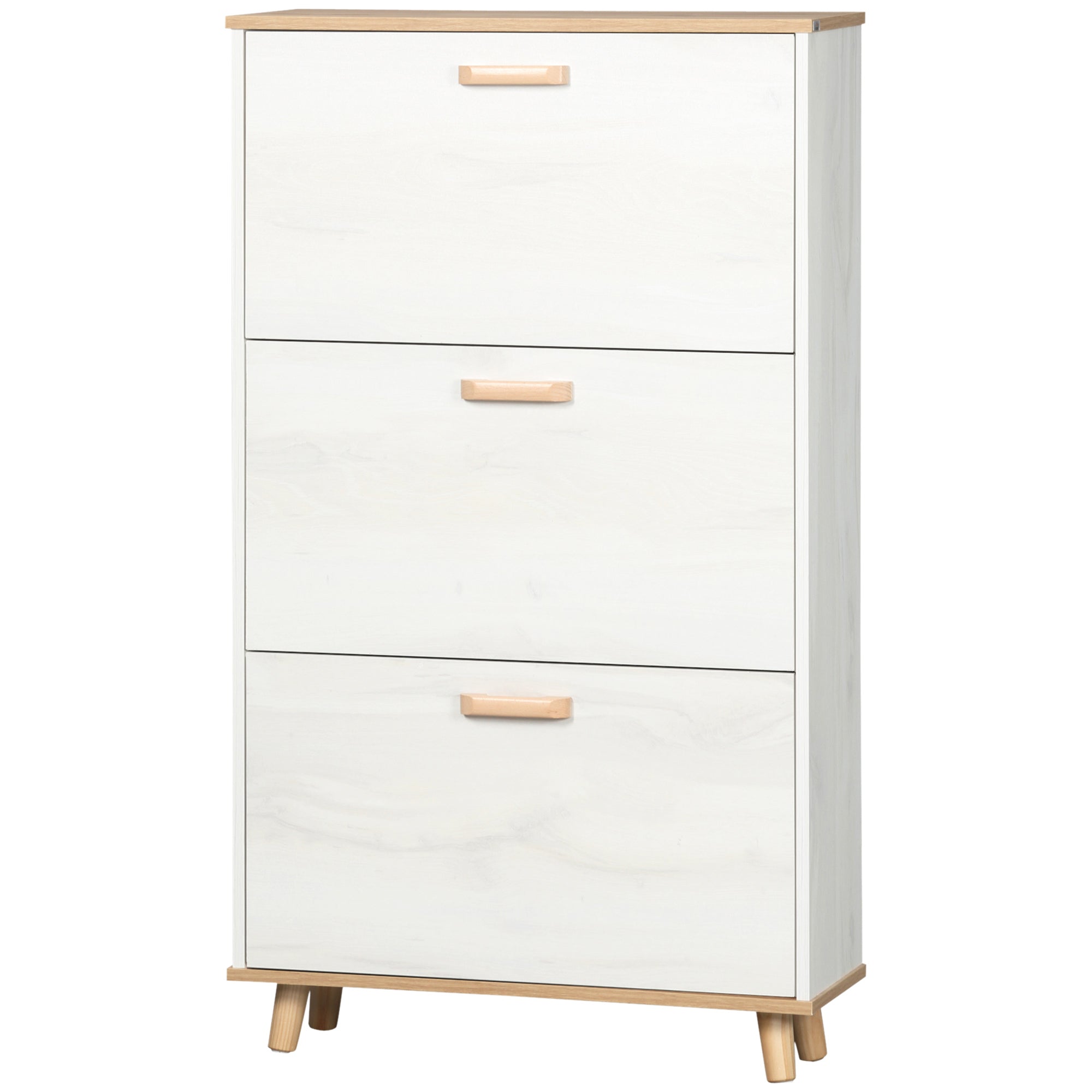 HOMCOM Шкаф за обувки с 3 падащи врати и 3 отделения, Дървена конструкция, 60 дължина x 26 ширина x 124 височина cm, Висок гланц бял