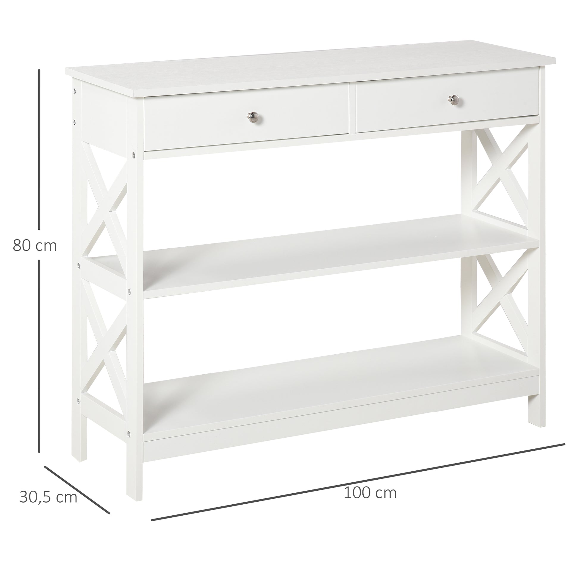 Конзолна маса HOMCOM за вход с 2 чекмеджета и 2 долни рафта, Модерни мебели, Повдигната основа, Устройство против падане 100x30.5x80 см Бял
