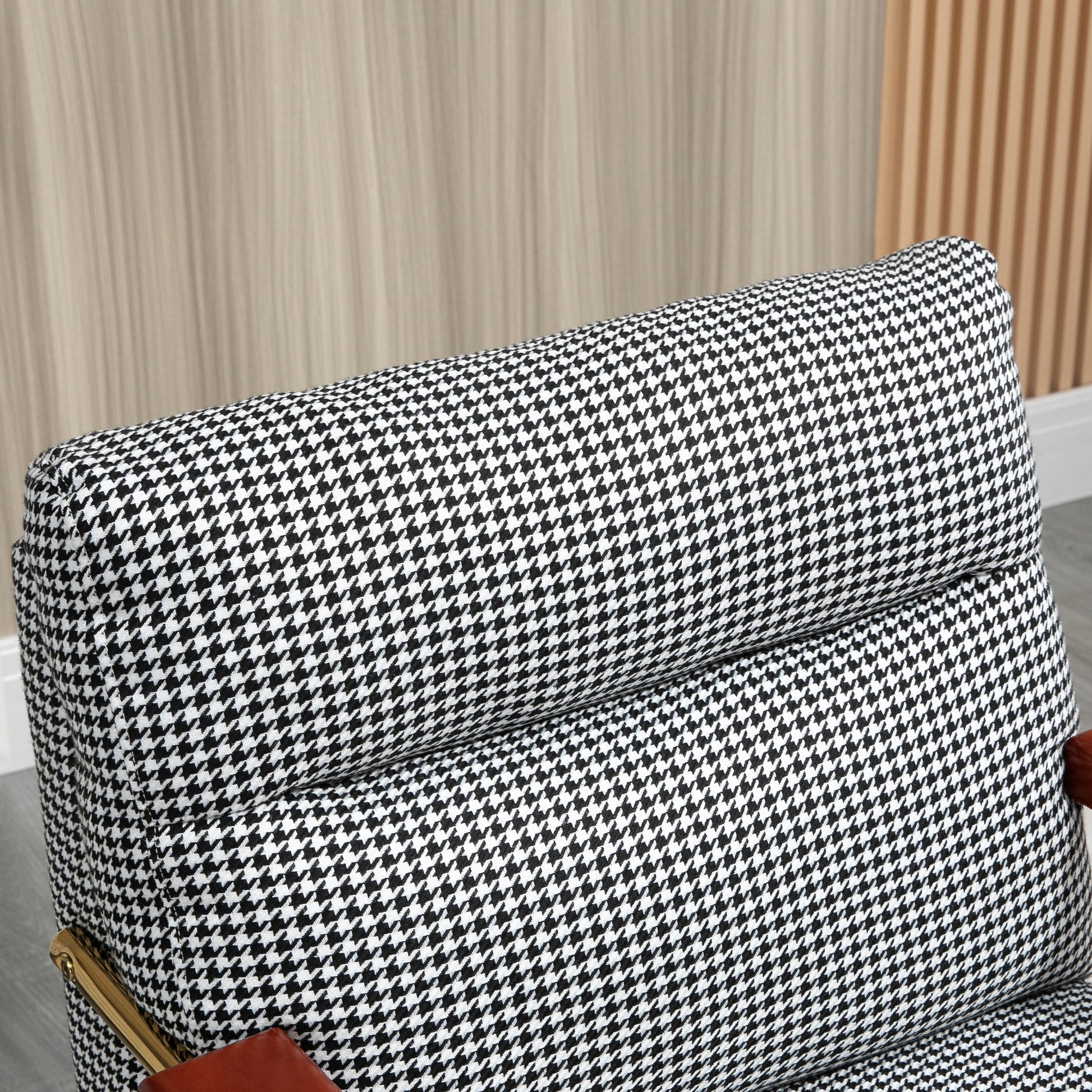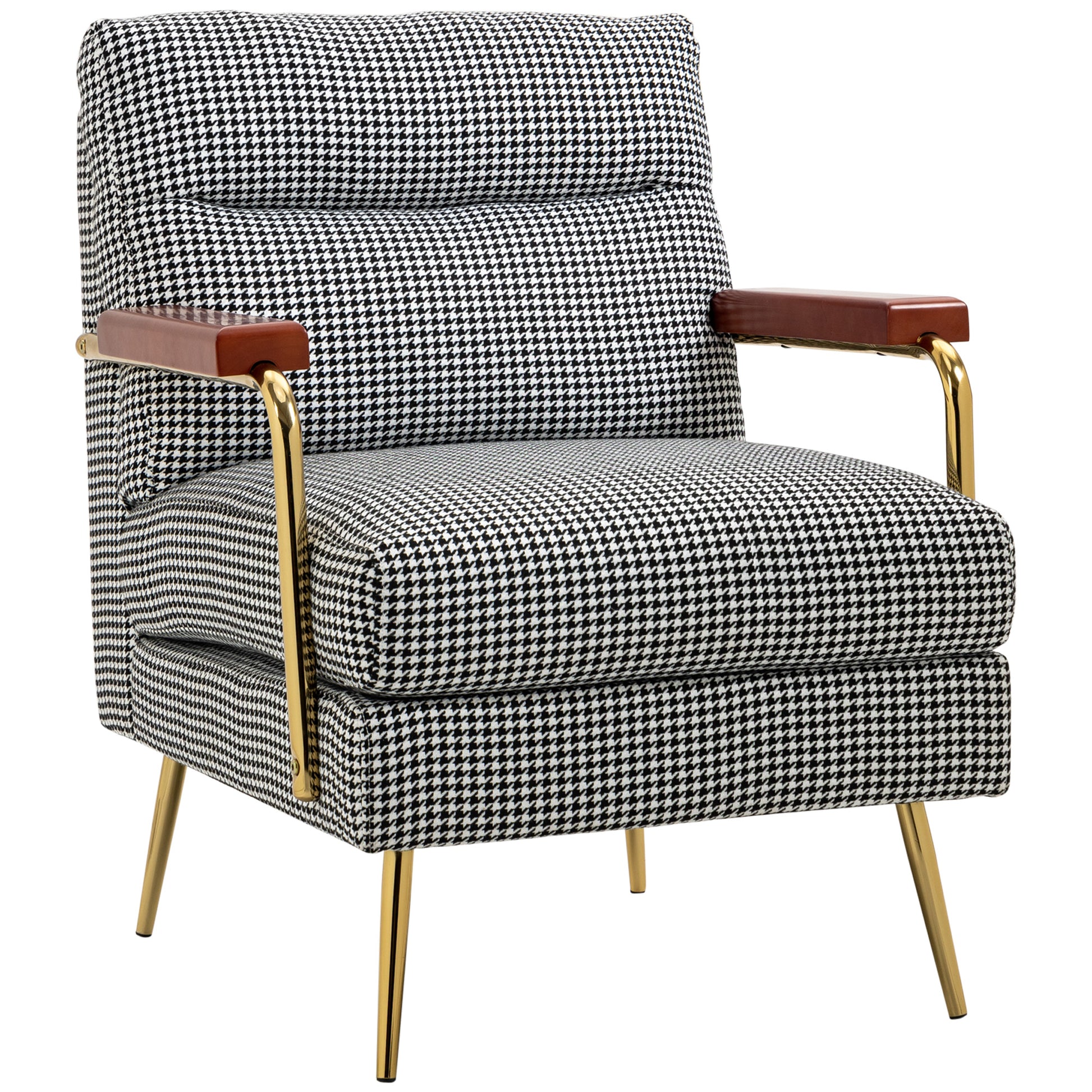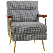 - - Добавете елегантност в дома си: Комбинацията от шахматна шарка, златисти метални крака и кафяви дървени елементи на подлакътниците правят този стол впечатляващ пример за ретро дизайнерско обзавеждане.