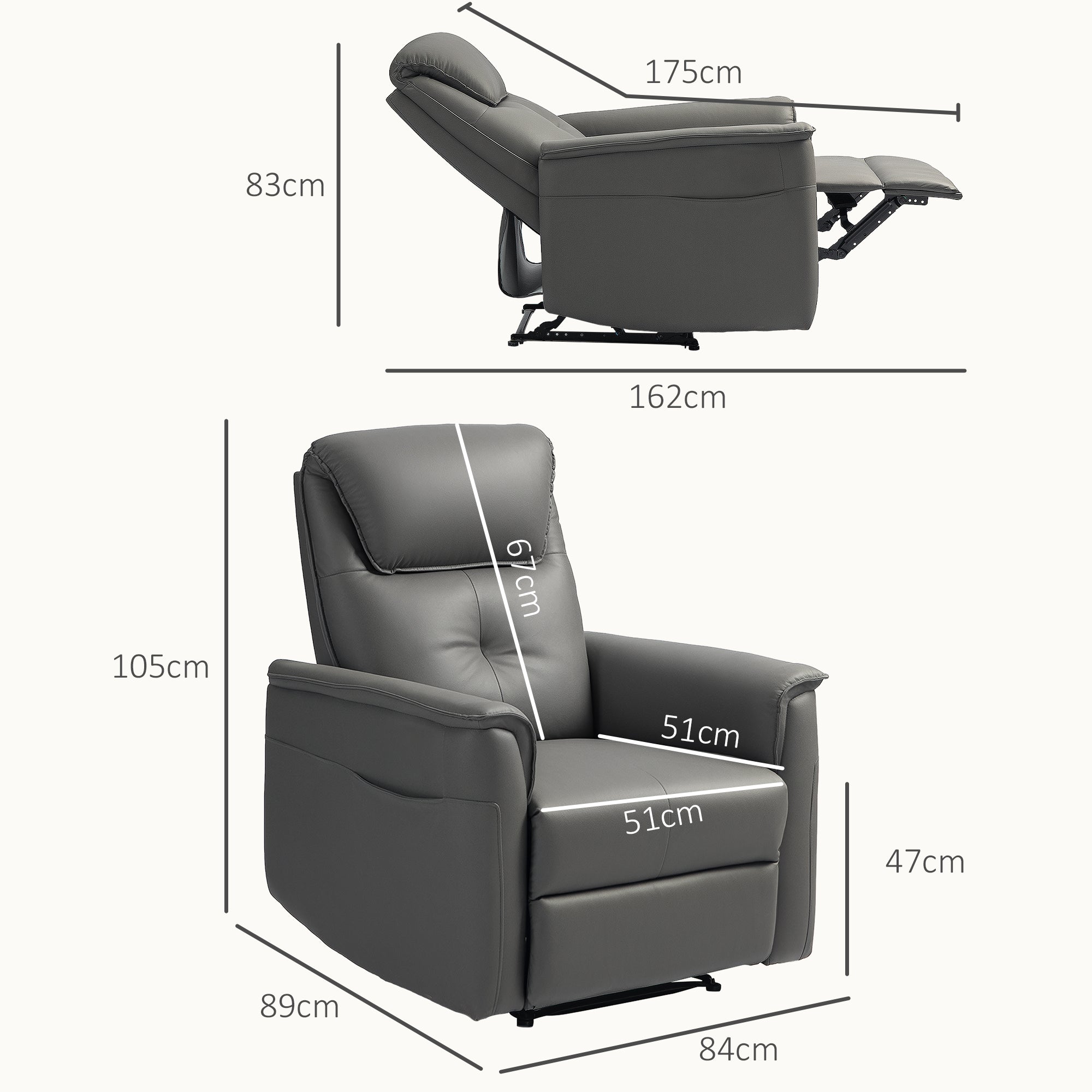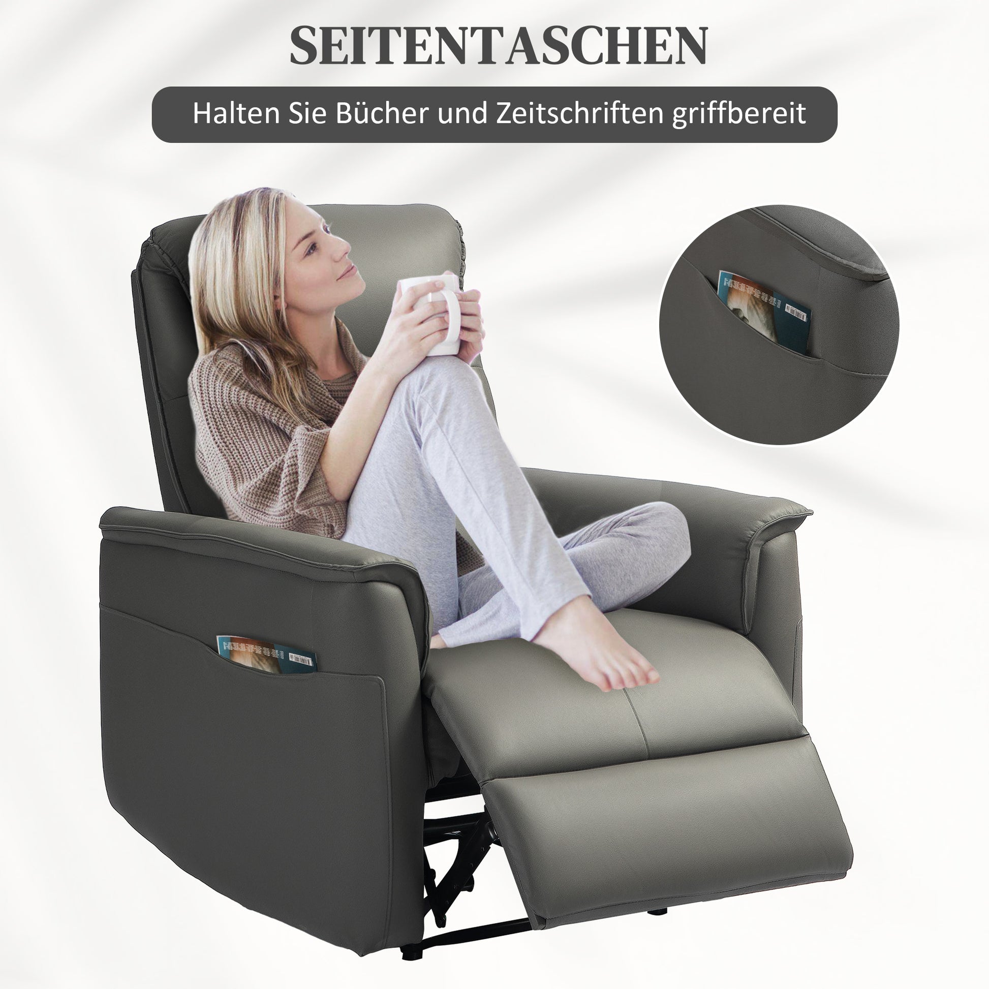 - - Здрав и практичен: Този фотьойл с наклон е конструиран на здрав метален каркас, който поддържа до 135 кг. Той предлага стабилност и дълготрайна издръжливост, идеален за всяка всекидневна или спалня. Два странични джоба предлагат удобен склад за четива.