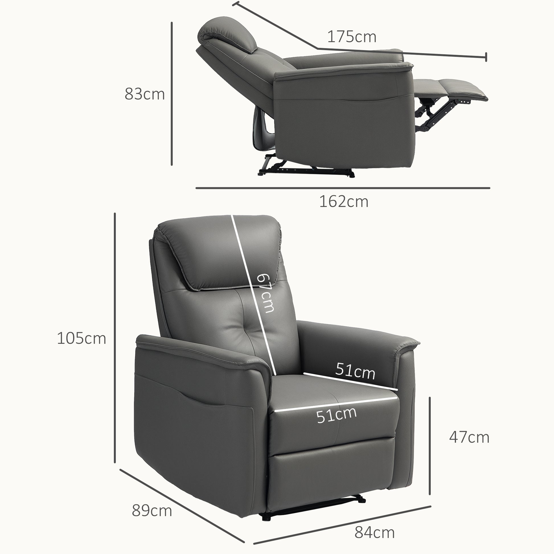 - - Информация за продукта относно телевизионния фотьойл с функция за наклон: Общо размери: (Изправен) 84Ш x 89Д x 105В см, (Наклонен) 84Ш x 162Д x 83В см, необходимо е сглобяване.