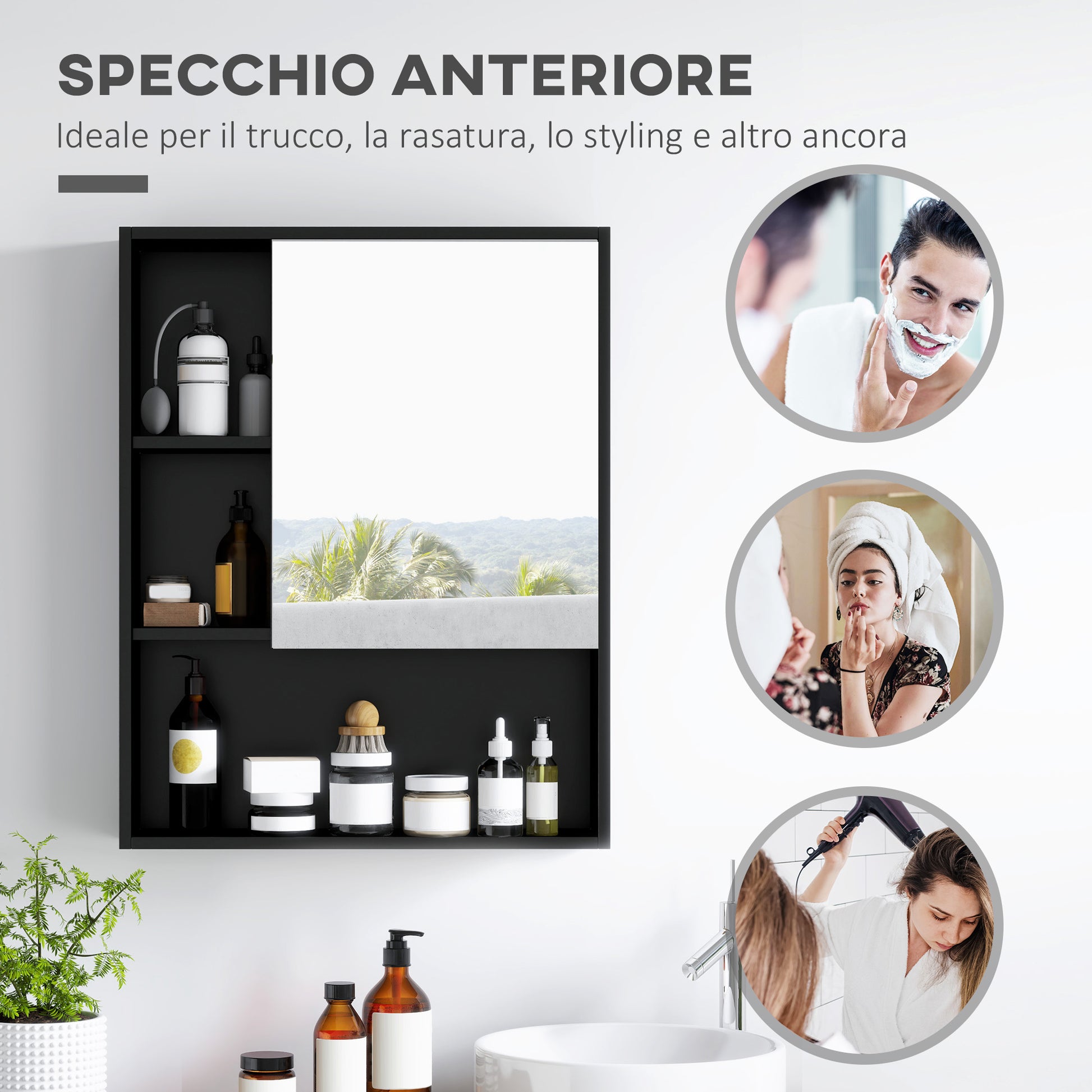 - - СТЕНЕН: Кабинетът за баня с огледало е фиксиран за стената, за да оптимизира вертикалното пространство и да ви предостави практична опора за съхранение на всички ваши ежедневни продукти