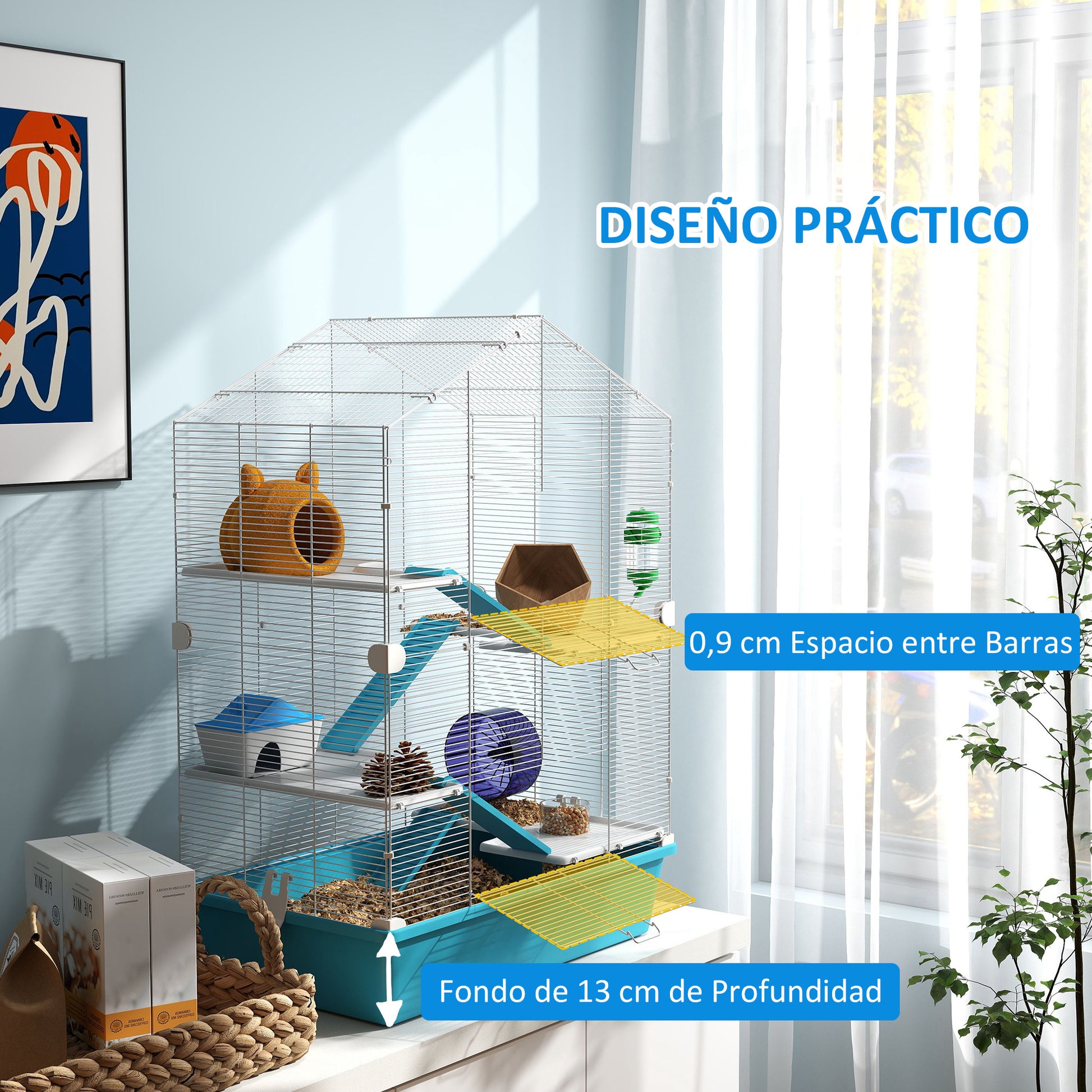 PawHut 5-етажна клетка за хамстери – домче за малки животни с платформи, купичка, пиечка, рампи и колело за упражнения 58x36x81 см Светлосин