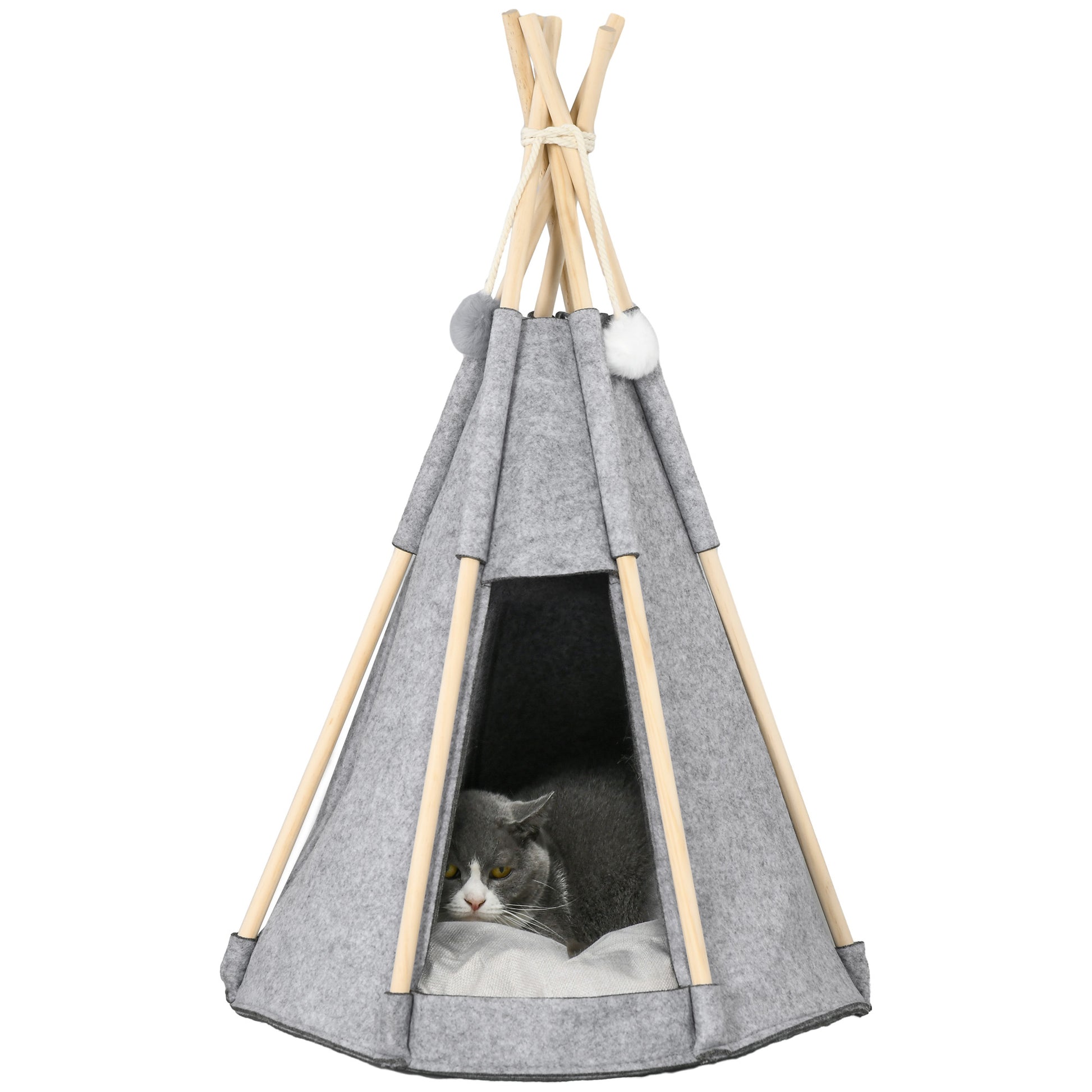 PawHut Детска палатка за любимци - Сива палатка за котки или малки кучета - дебел възглавница за максимален комфорт, включени 2 помпончета - конструкция от борова дървесина, мек сив плюш