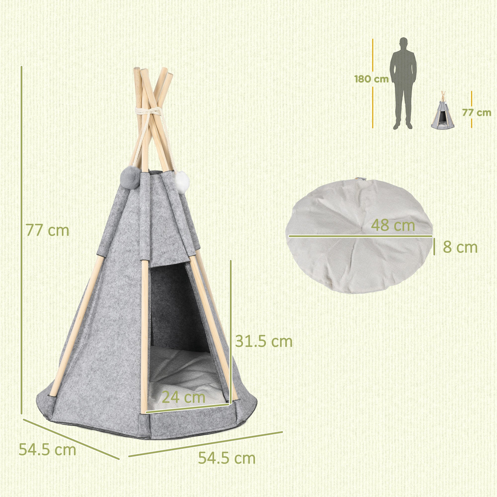 - - ПЪЛЕН И ИЗДРЪЖЛИВ КОМПЛЕКТ: 1 x палатка, 5 x борова дървена пръчка, 1 x дебела възглавница, 1 x въже и 2 x помпончета - Изработена от качествена борова дървесина и издръжлив филц, тази палатка е безопасна и стабилна за ежедневна употреба - Удобно, възглавницата и филцът могат да се перат в машина.