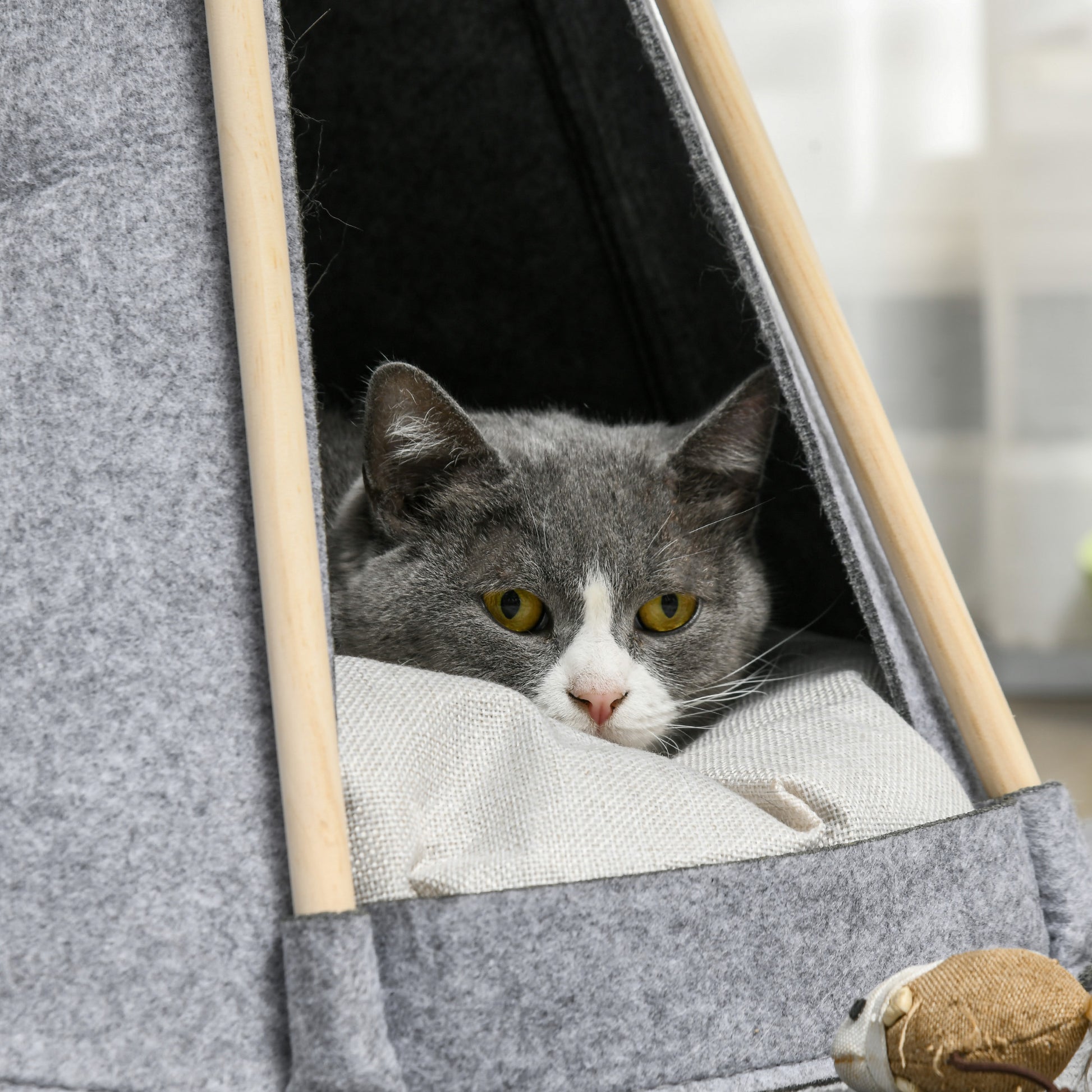 - - МАКСИМАЛЕН КОМФОРТ И УДОБСТВО: Включена дебела пухкава възглавница за максимален комфорт на вашия любимец. Облечена в мек плюш, вашата котка ще обожава да се оттегли в своята палатка за дълги дрямки. Възглавницата е подвижна за лесно почистване.