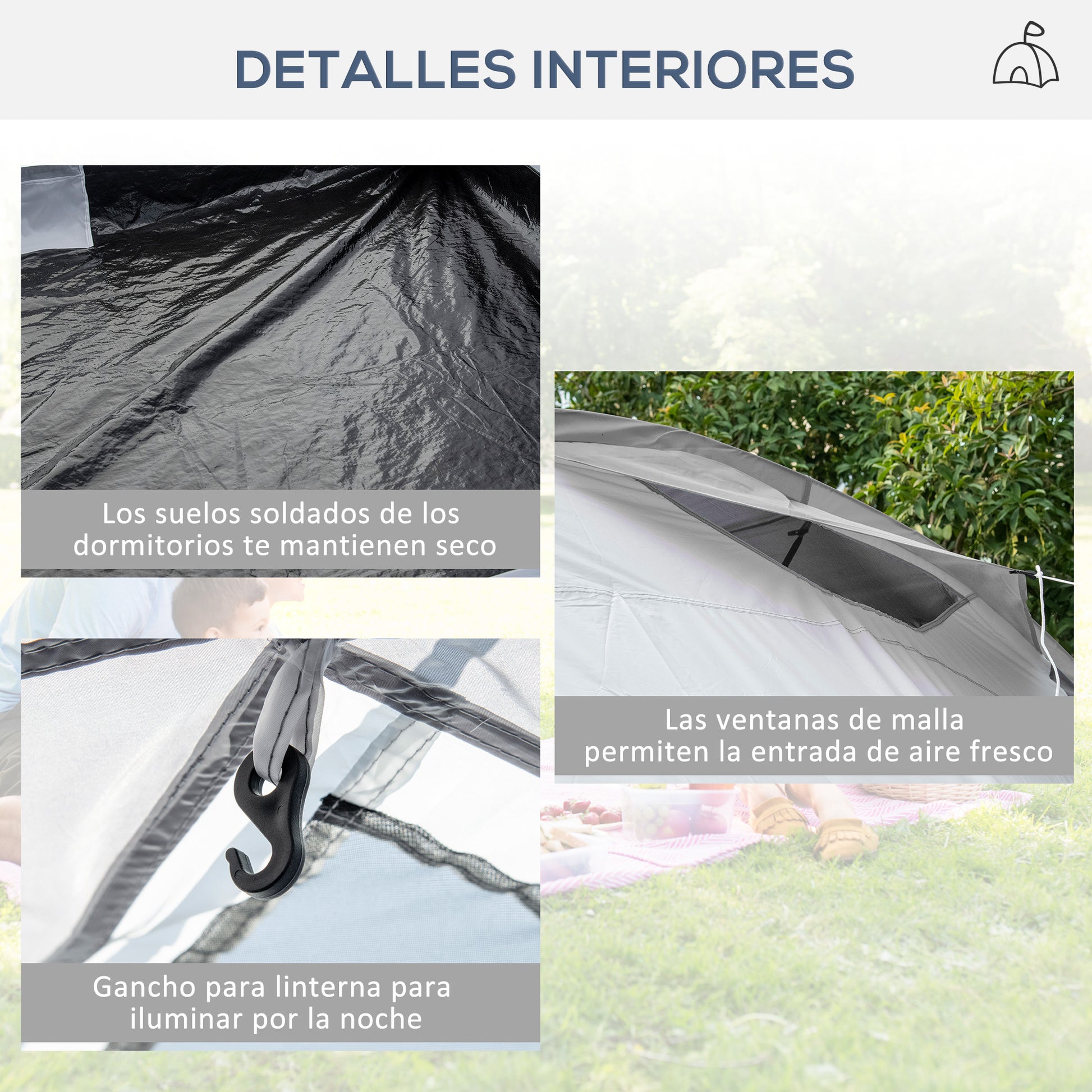 - - ДОБРЕ ОБОРУДВАНА ПАЛАТКА: Тази палатка с 2 стаи разполага с кука за лампа и шит под в стаите, за да ви осигури сухота. Двете големи врати с цип и мрежи за комари осигуряват бърз достъп. Мрежестите прозорци позволяват циркулация на въздуха. Входната врата може да бъде преобразувана в навес благодарение на металните колчета, за да предостави допълнителна сянка при входа.