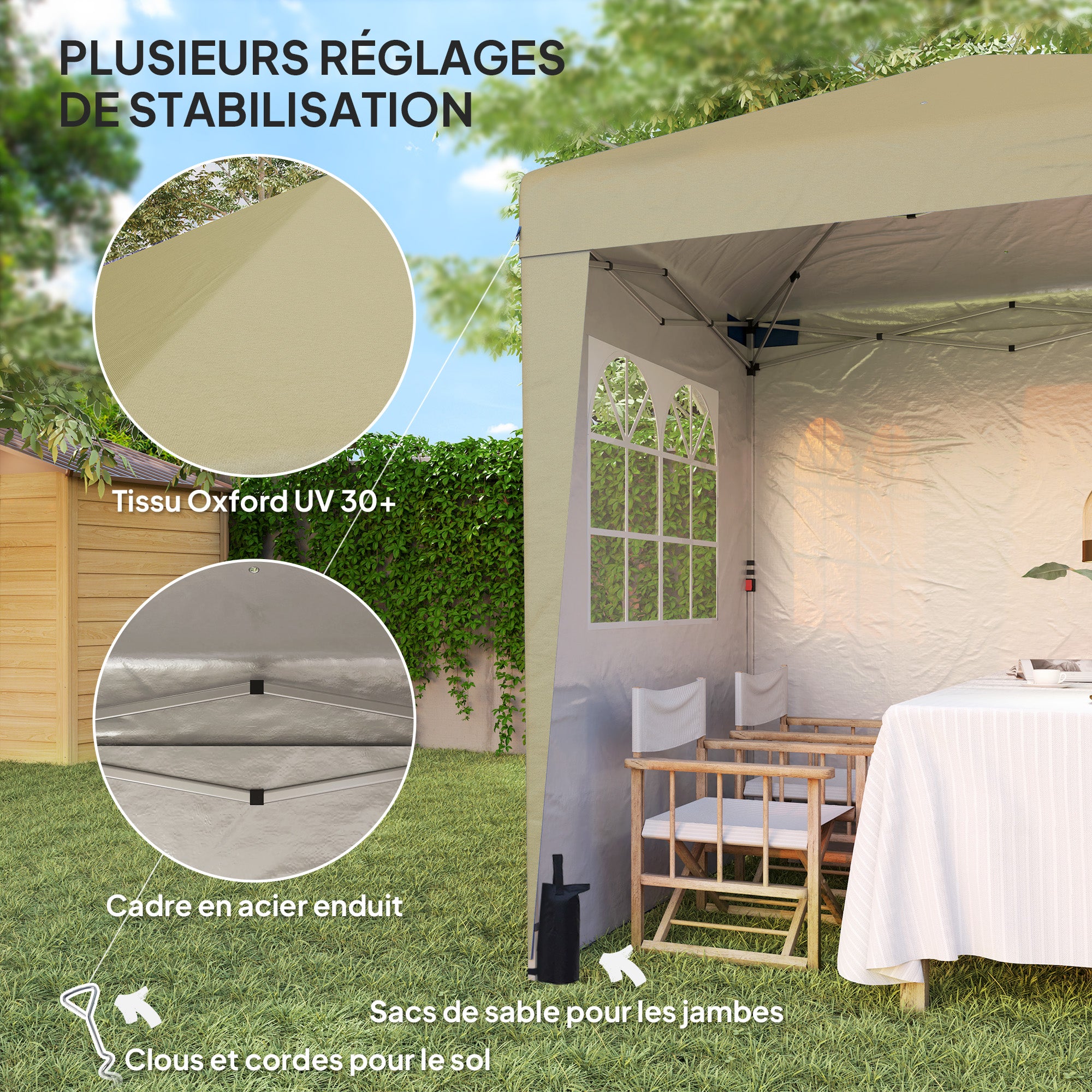 Сгъваем навес за градината Outsunny 2 x 2 м – Изпъкваща шатра с регулируема височина на 3 нива, анти-UV 30+, 3 странични стени с 4 пясъчни чанти и 1 чанта за носене от оксфордска тъкан, стомана, бежов