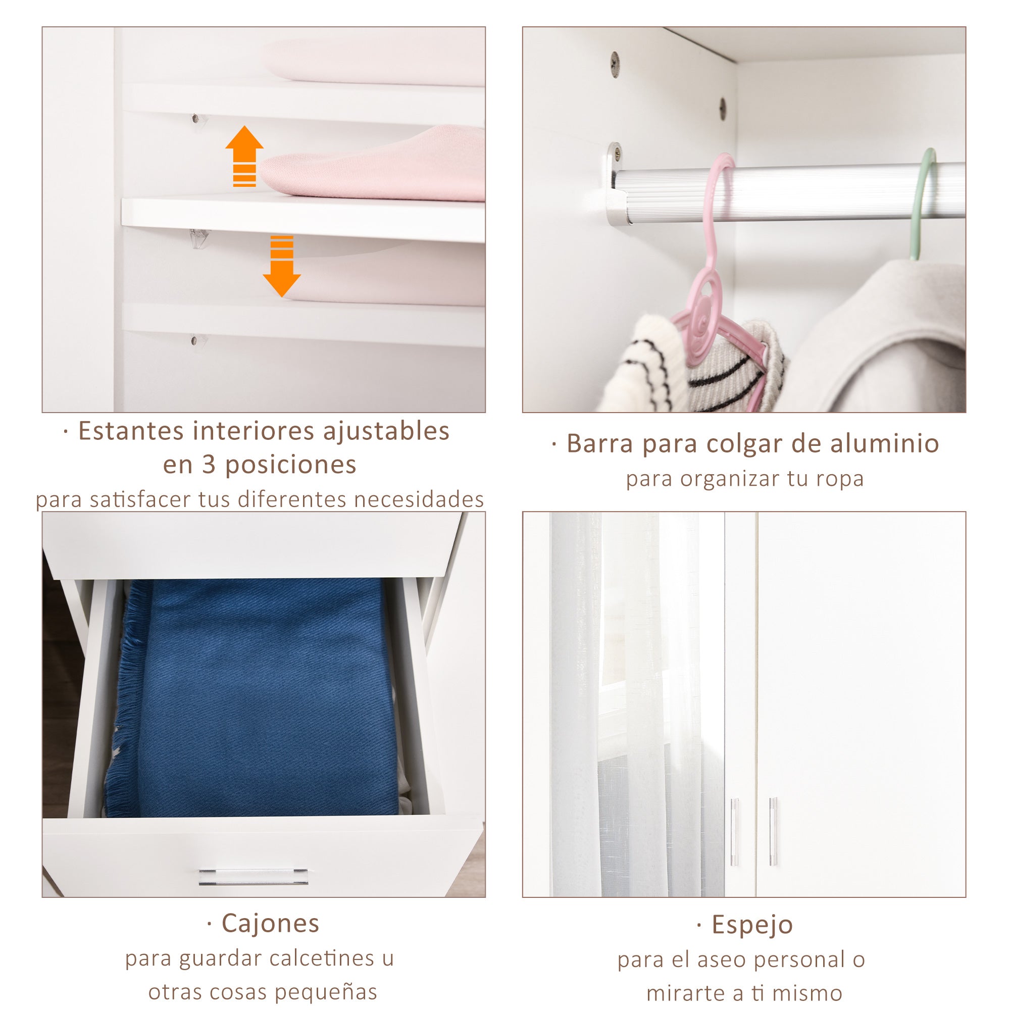 Шкаф с 2 врати HOMCOM, Огледало, 3 чекмеджета, Регулируеми рафтове и включена шина за закачане, Мебели за спалня 80x50x180 см Бял