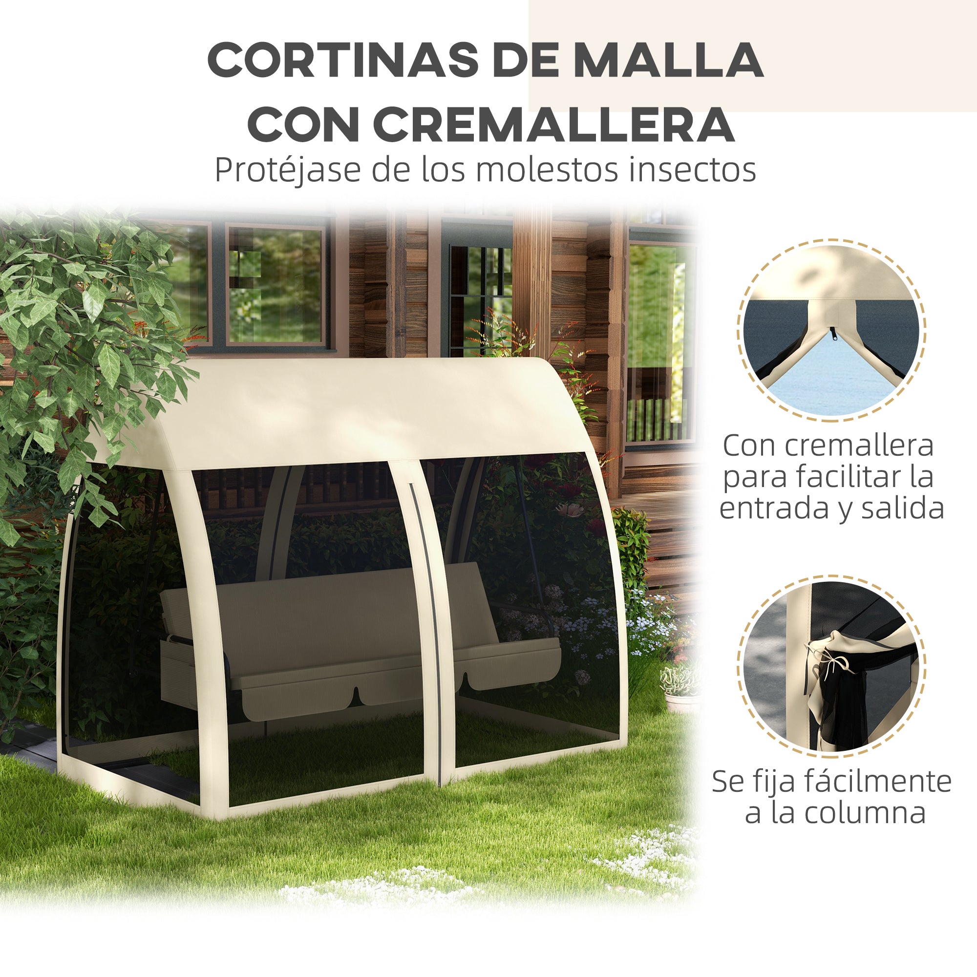 Стол за люлеене Outsunny с 3 места, преобразуващ се в легло с комарник, метална конструкция, товароносимост 300 кг, размери 240x140x197 см, бежов