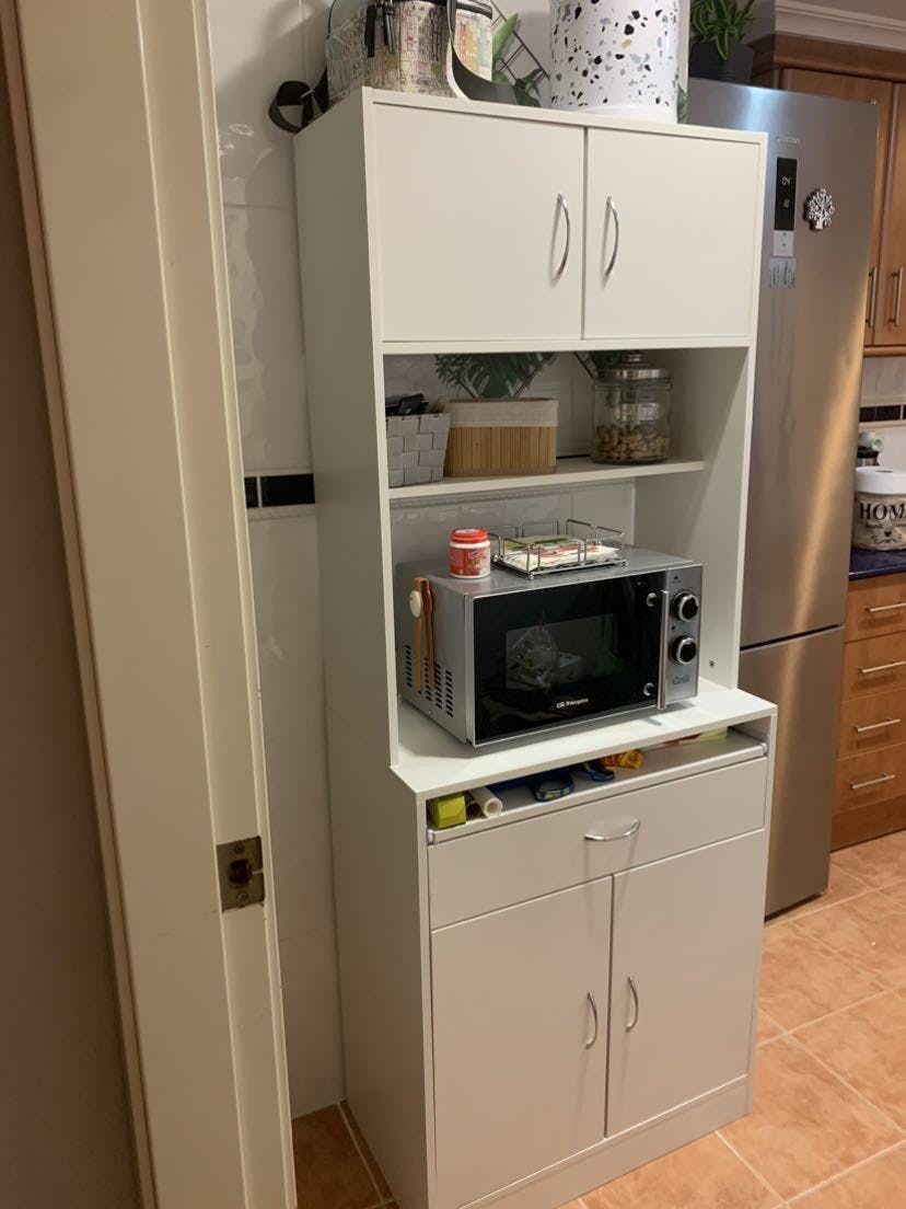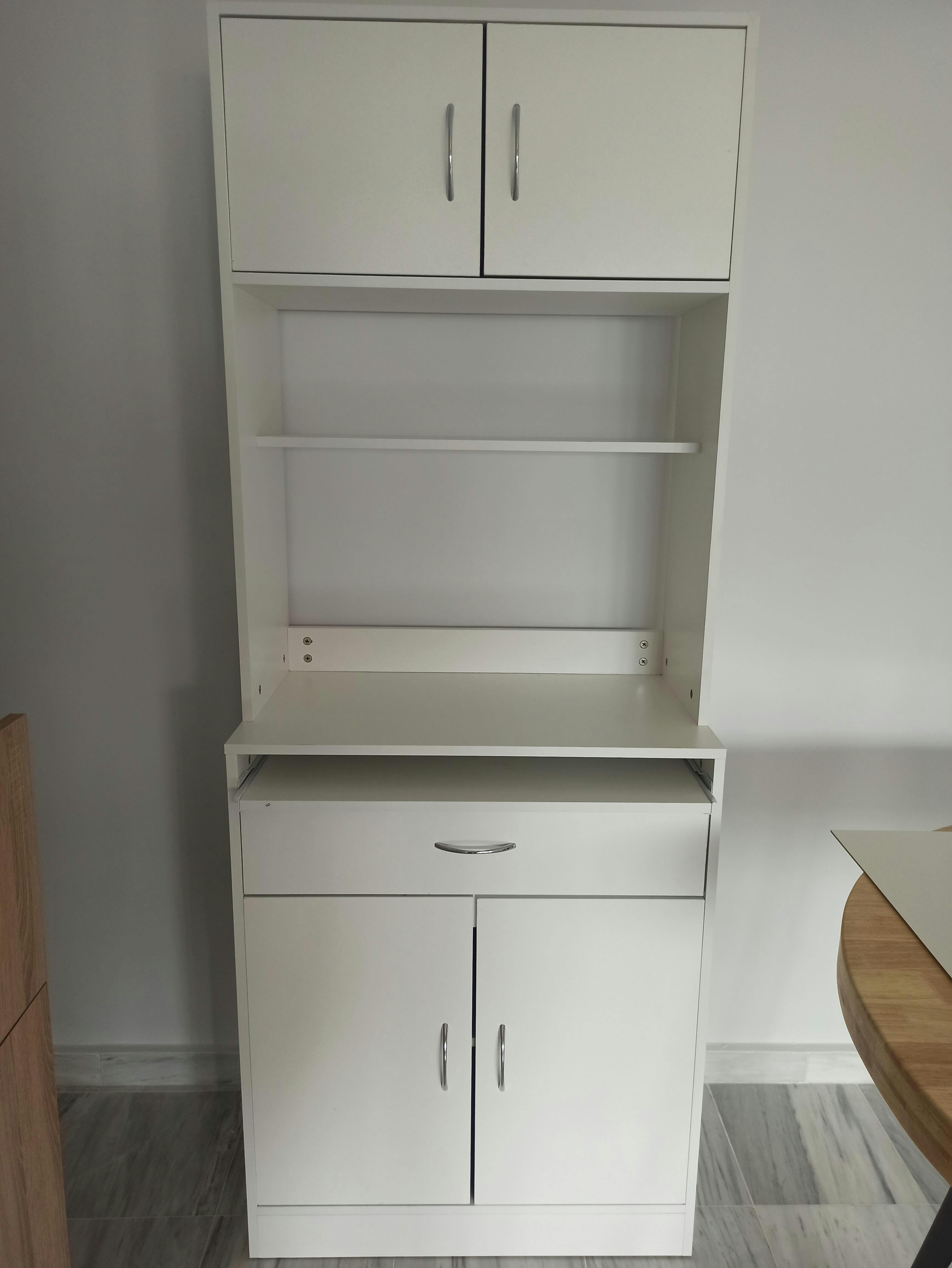 - - ENHANCE YOUR STORAGE: This kitchen furniture has ample storage space. It includes 2 cabinets with doors, a shelf, an open shelf, a drawer, and a sliding tray. Ideal for storing pots, pans, utensils, and towels in the drawer or placing the microwave or coffee maker on the shelf