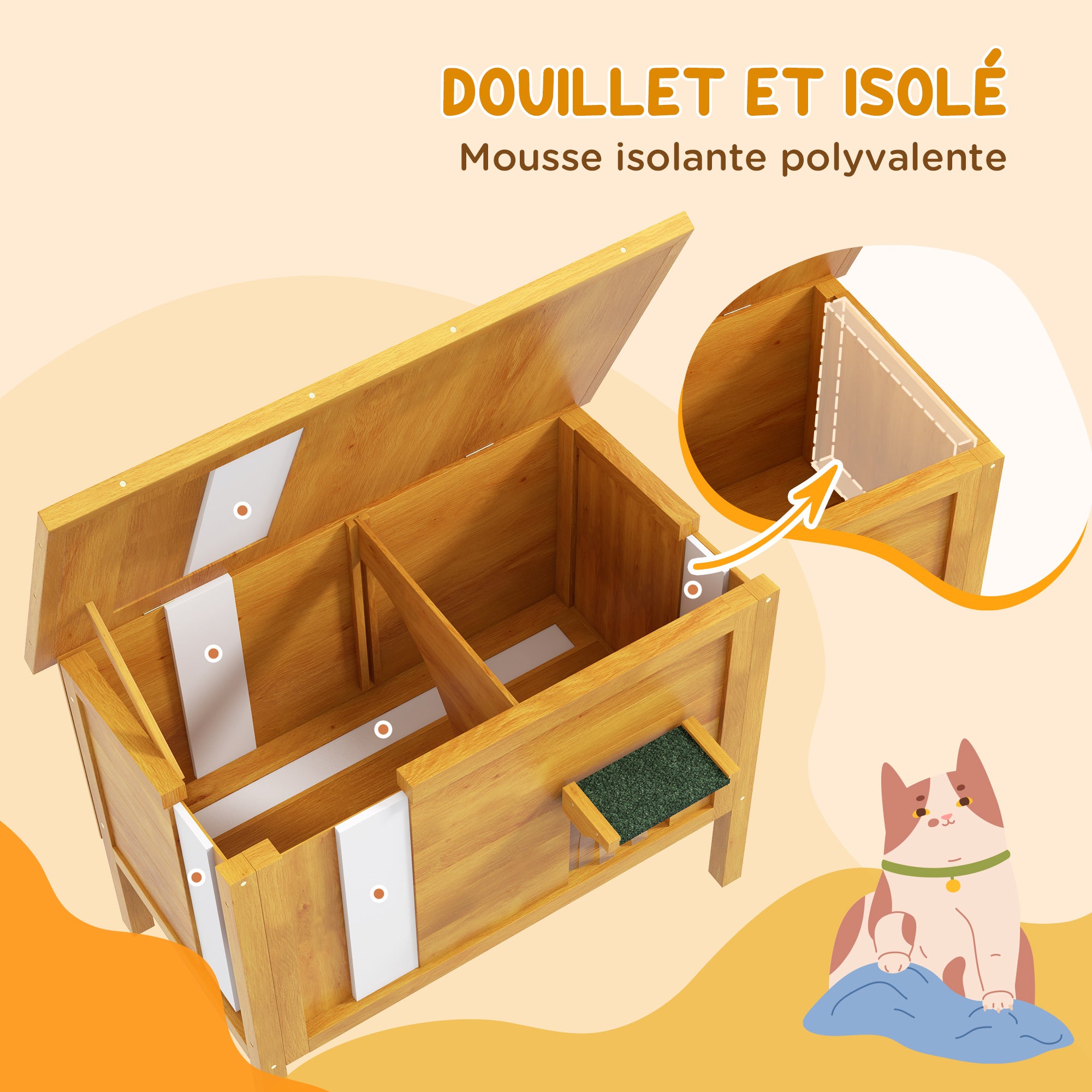 PawHut Venkovní kočičí dům se zvýšenou dřevěnou konstrukcí a otevíratelnou střechou, zateplený asfaltovou střechou, 85 x 50 x 68,5 cm, přírodní a zelený
