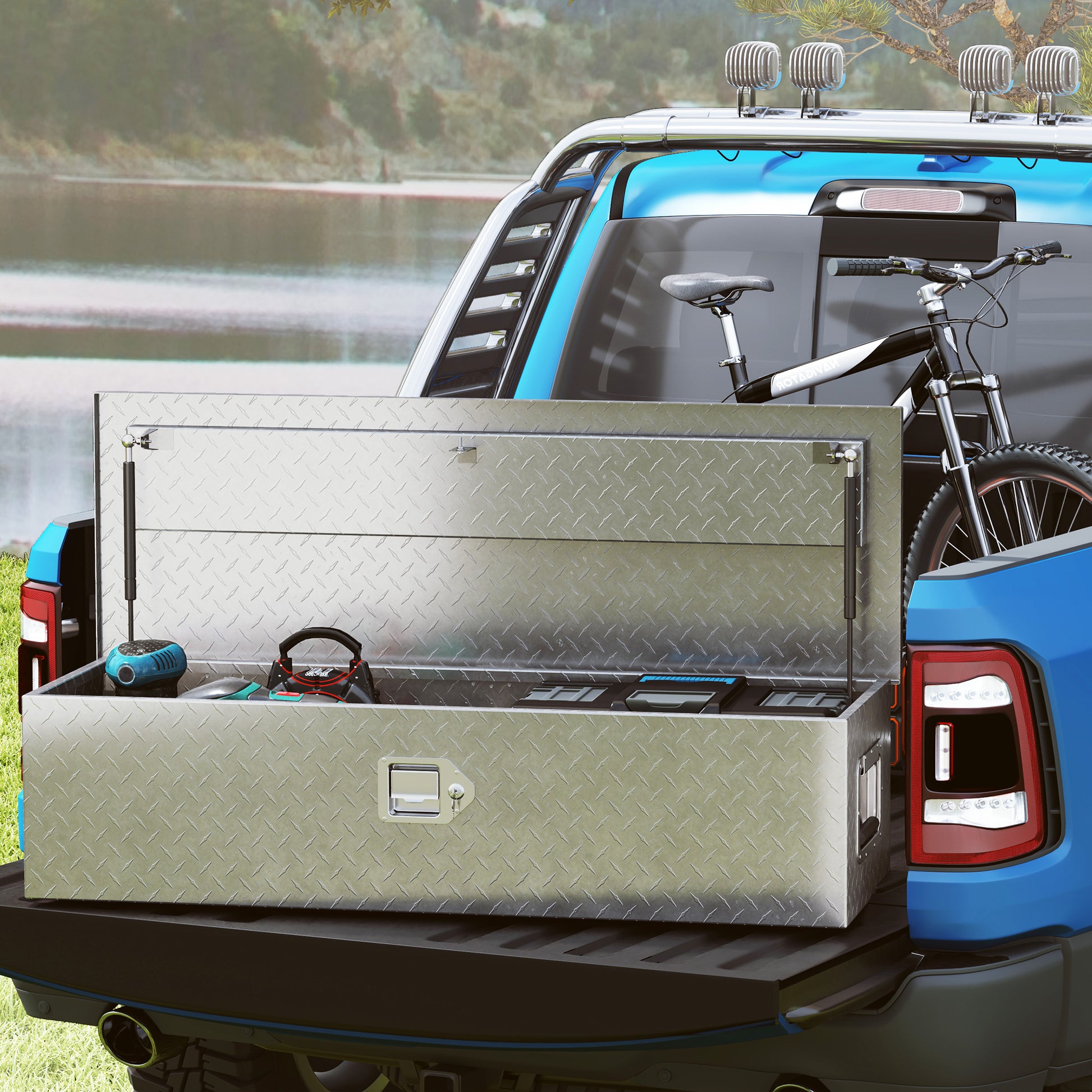 - - Robust og let: Lavet af forstærket aluminium diamantplade med beskyttende maling, vores lastbil opbevaringskasse modstår rust, korrosion og slid, samtidig med at den forbliver let, så den ikke belaster traileren.