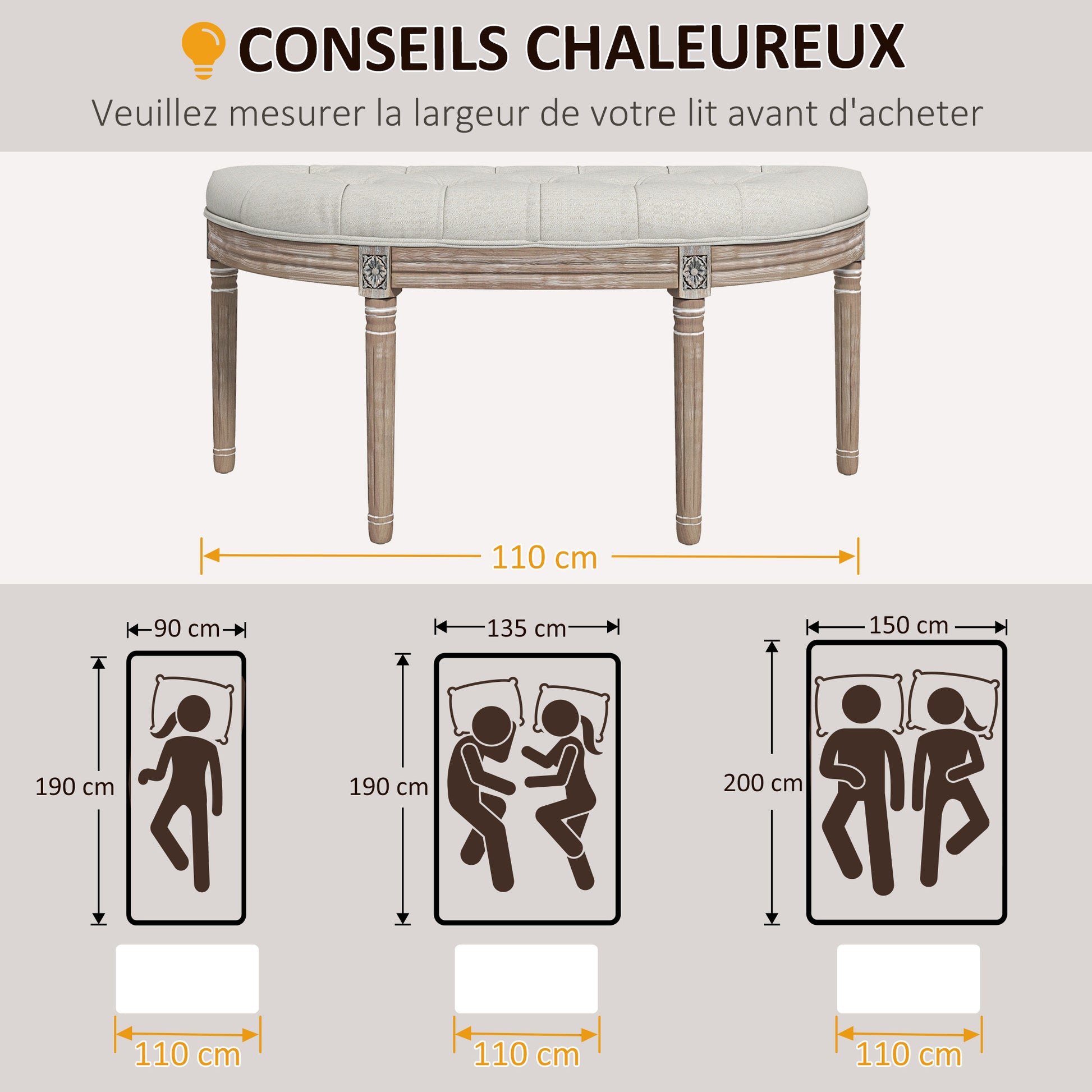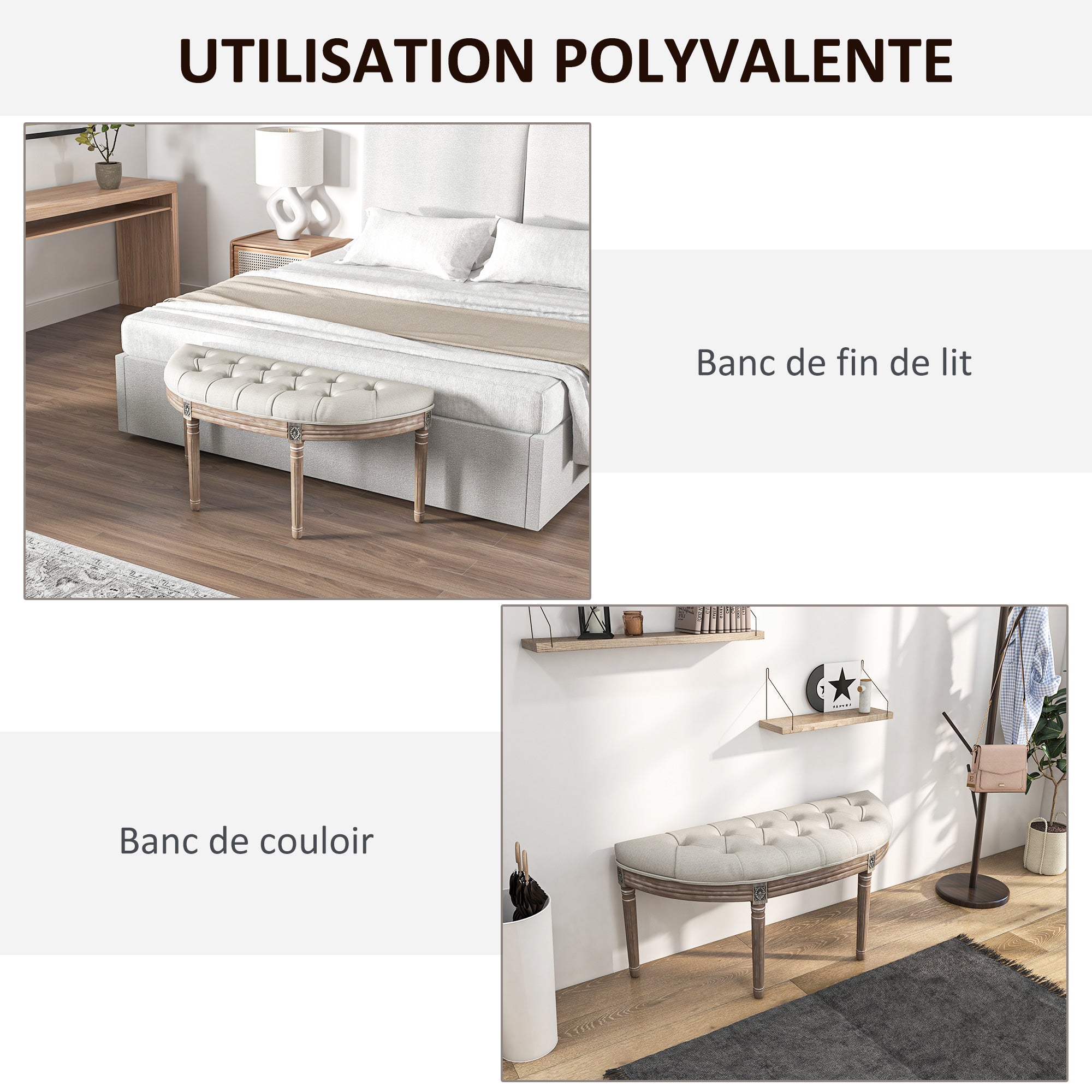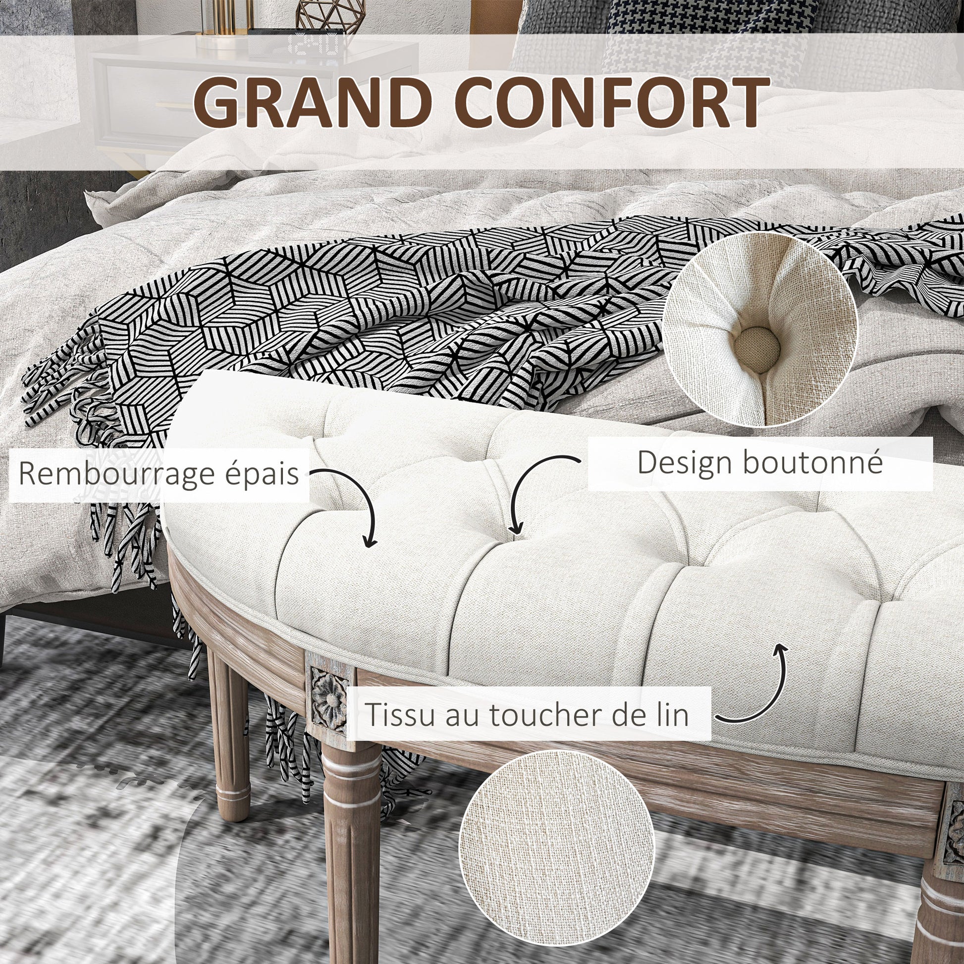 HOMCOM Halvmåne Polstret Bænk til Enden af Sengen, Knappet Bænk, Louis XVI Stil, Solid Træstruktur, Slidt Finish, Linned-Lignende Stof, Creme