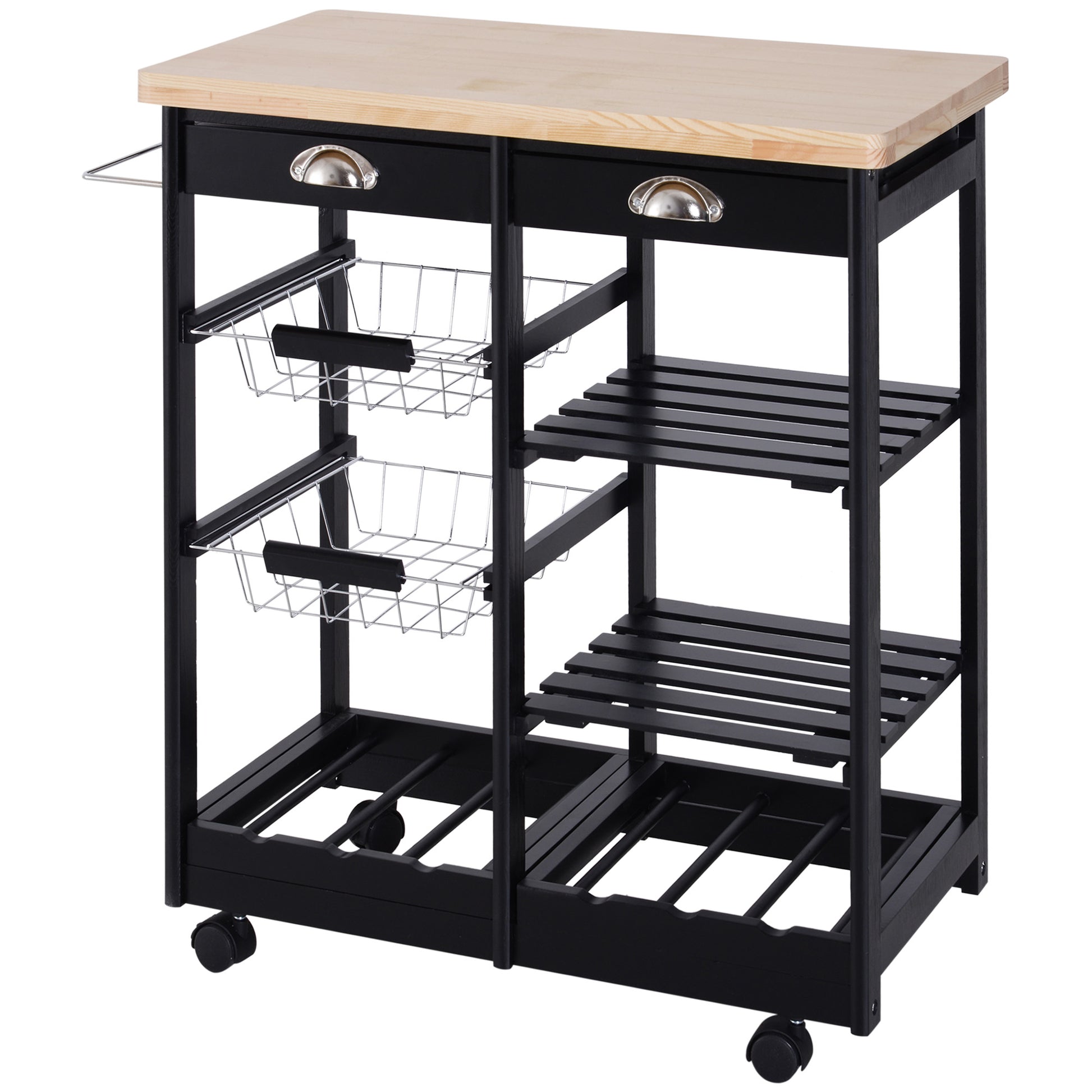 HOMCOM Mobil Køkkenvogn med Hjul - Grøntsagsvogn til Køkken med 2 Skuffer, 2 Kurve og 2 Hylder til Spisestue 74x37x76 cm Sort