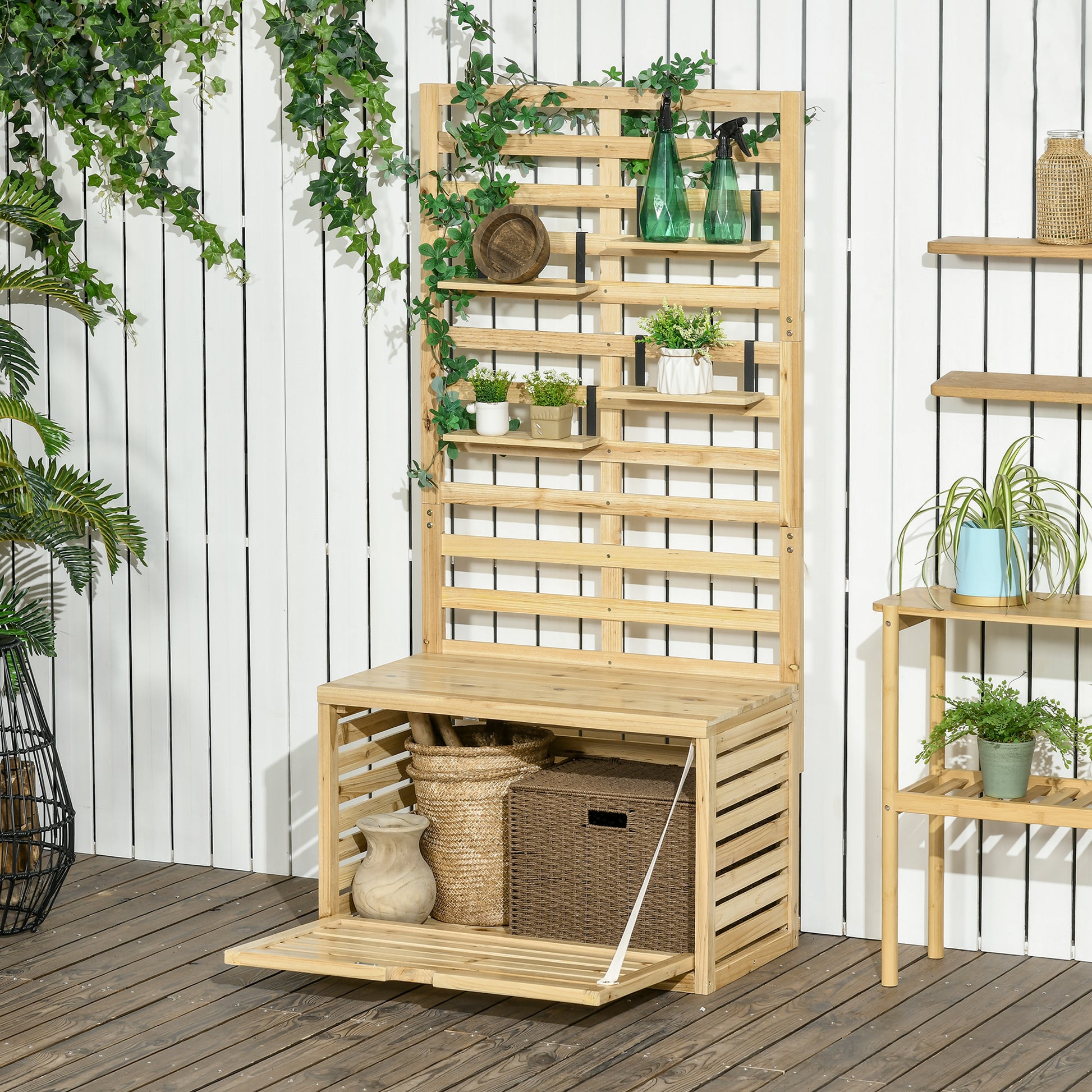 Outsunny Opbevaringsboks, Opbevaringskiste med Spalier, Pude Boks med Hylder, Havekiste, Pude Kasse, Massiv Træ, Naturlig, 80 x 45 x 160 cm