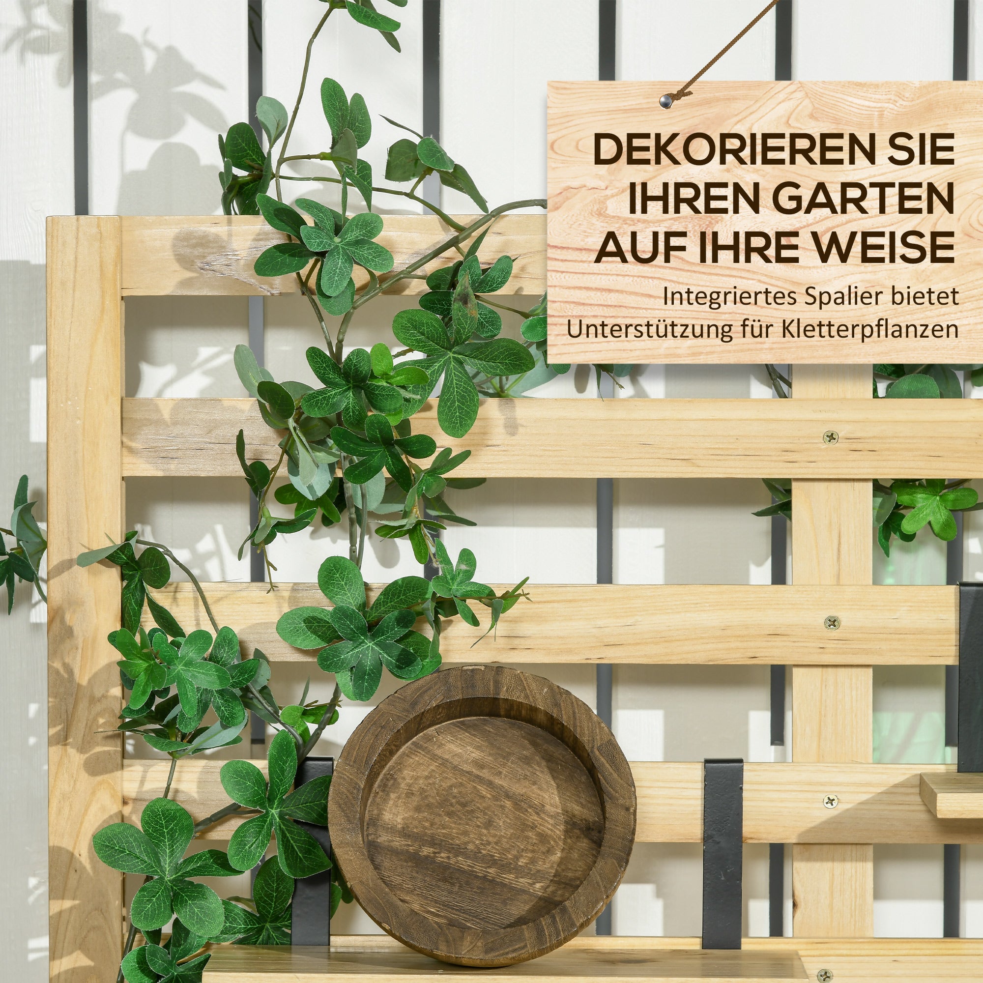 - - Inkluderer spalier: Det medfølgende spalier giver fremragende støtte til klatreplanter. De fire kompakte hylder kan hænges fleksibelt hvor som helst på spalieret og giver plads til blomsterpotter, dekorative elementer og mere.
