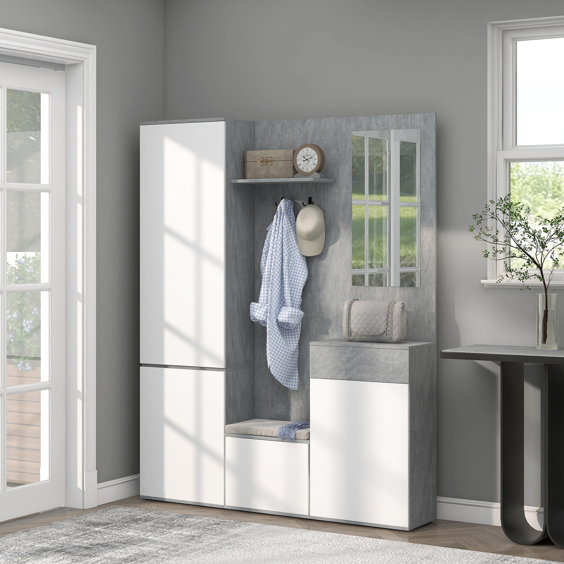 HOMCOM 4-in-1 Garderobenständer mit Spiegel, Haken und verstellbaren Innenregalen, Multitasking Holz-Garderobenmöbel mit Schublade, 145x29x184 cm, Grau und Weiß