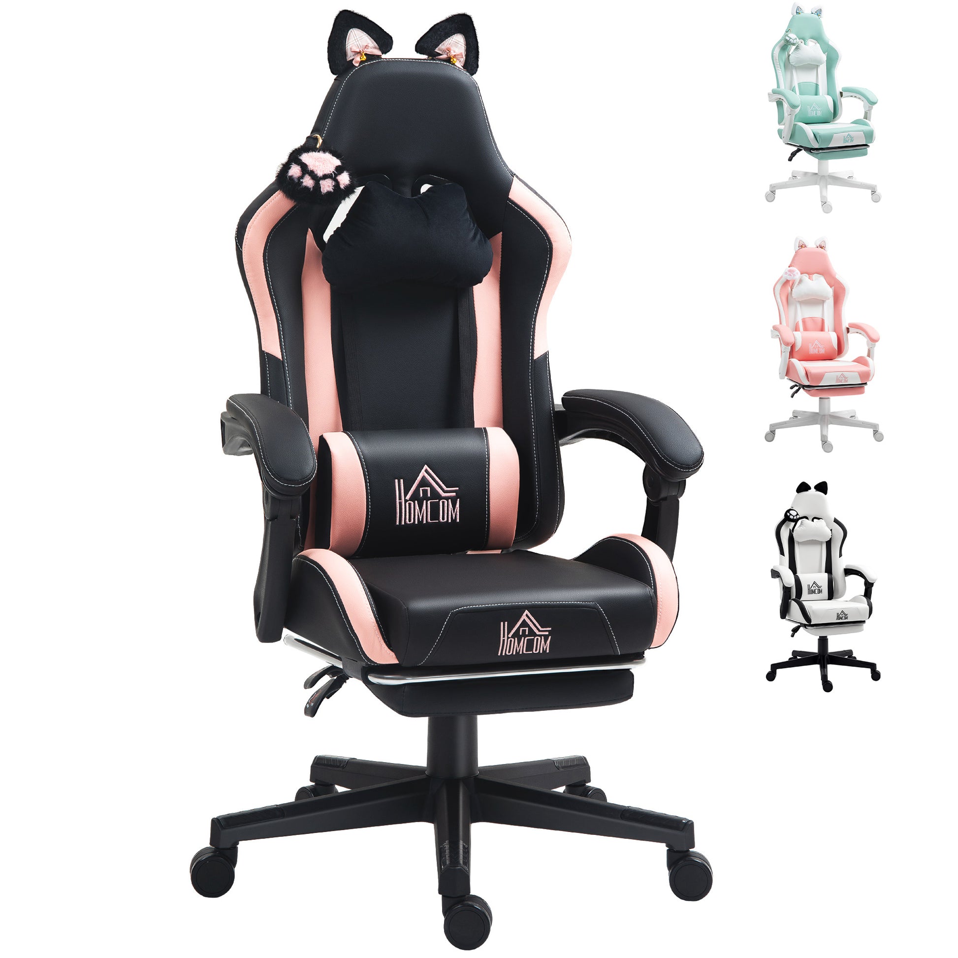HOMCOM Gaming-Stuhl mit Katzenohr-Design, neigbarer Gamer-Stuhl mit höhenverstellbarem, ausziehbarem Fußrest, Lendenstütze und abnehmbarem Kopfstützenstuhl für Büro und Studium schwarz