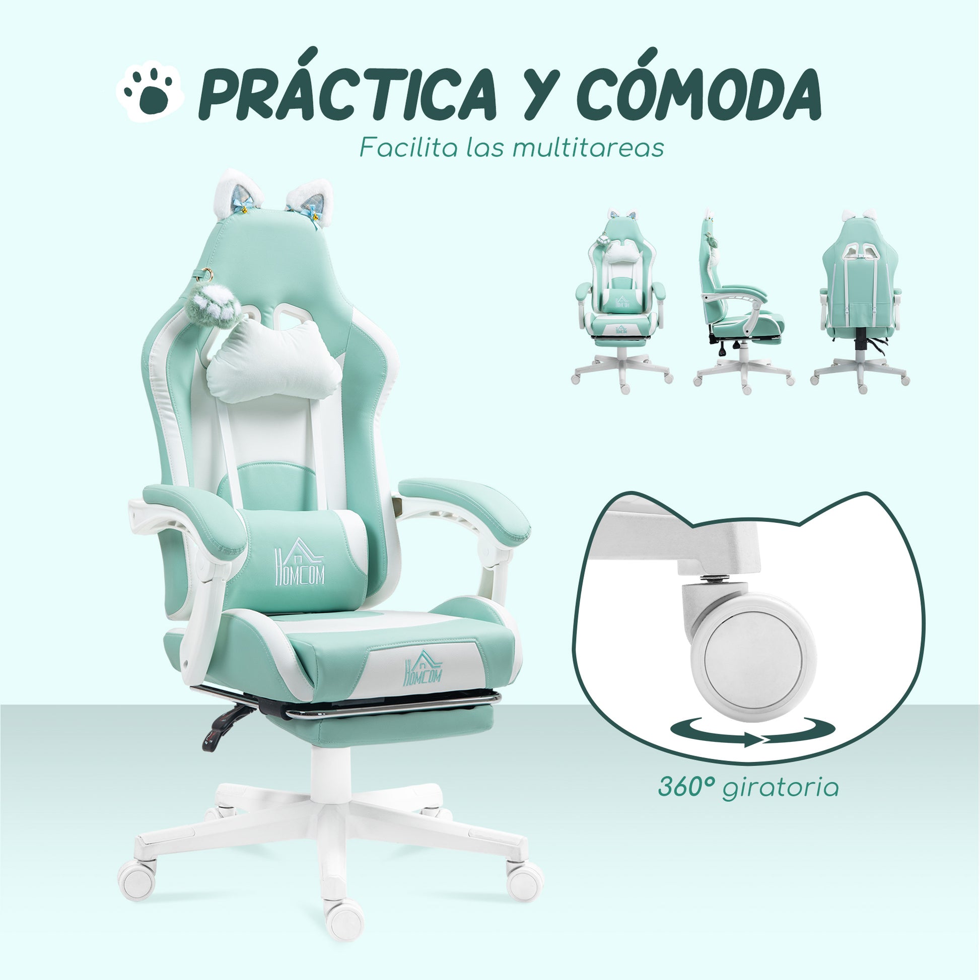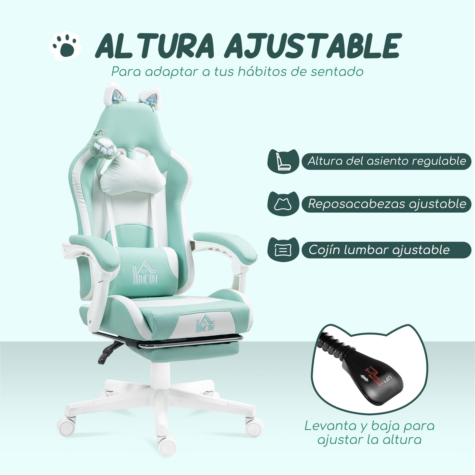 HOMCOM Gaming-Stuhl mit Katzenschwanz-Design, verstellbare Höhe, ausziehbare Fußstütze, Lendenstütze und abnehmbares Kopfkissen - Hellblau