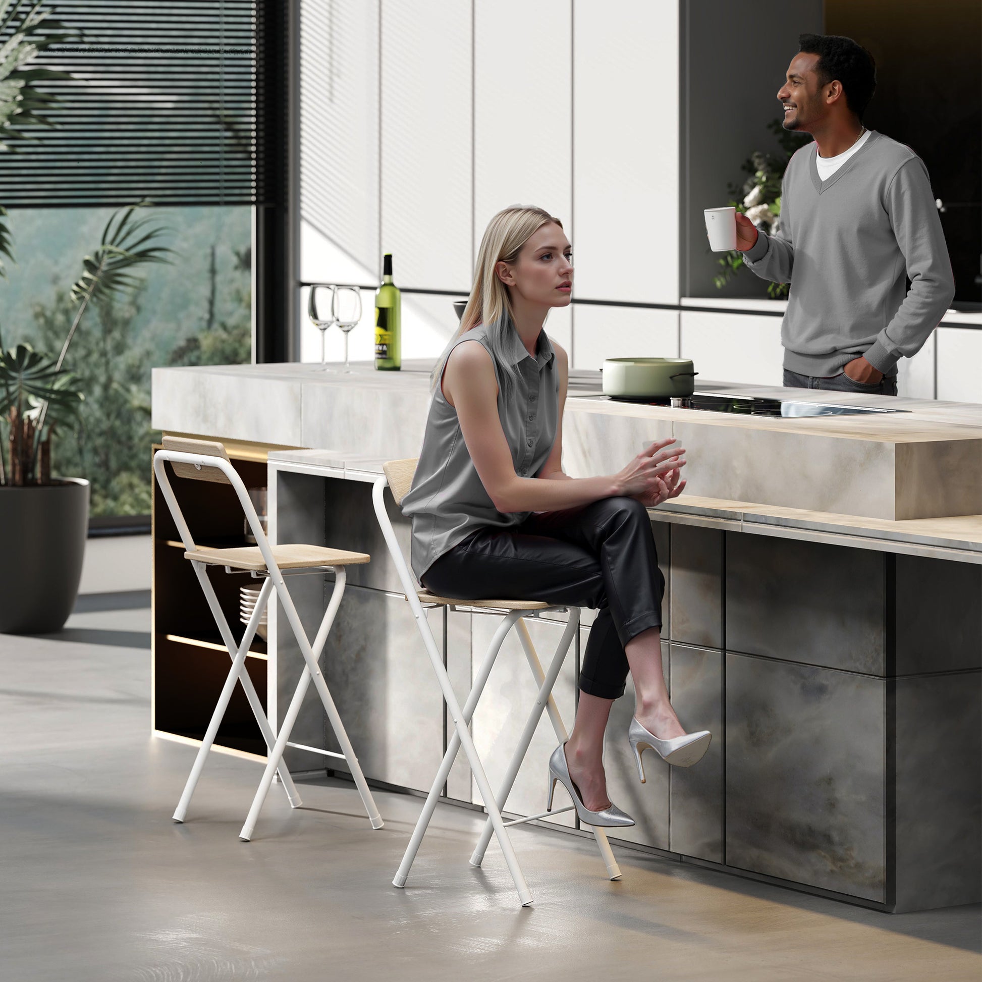 - - FALTBAR UND PLATZSPAREND: Dieser elegante Barhocker lässt sich komplett zusammenfalten und optimal verstauen. Ohne Armlehnen passt er perfekt unter die meisten Arbeitsflächen, ideal für kleine Räume wie schmale Küchen oder Studios.