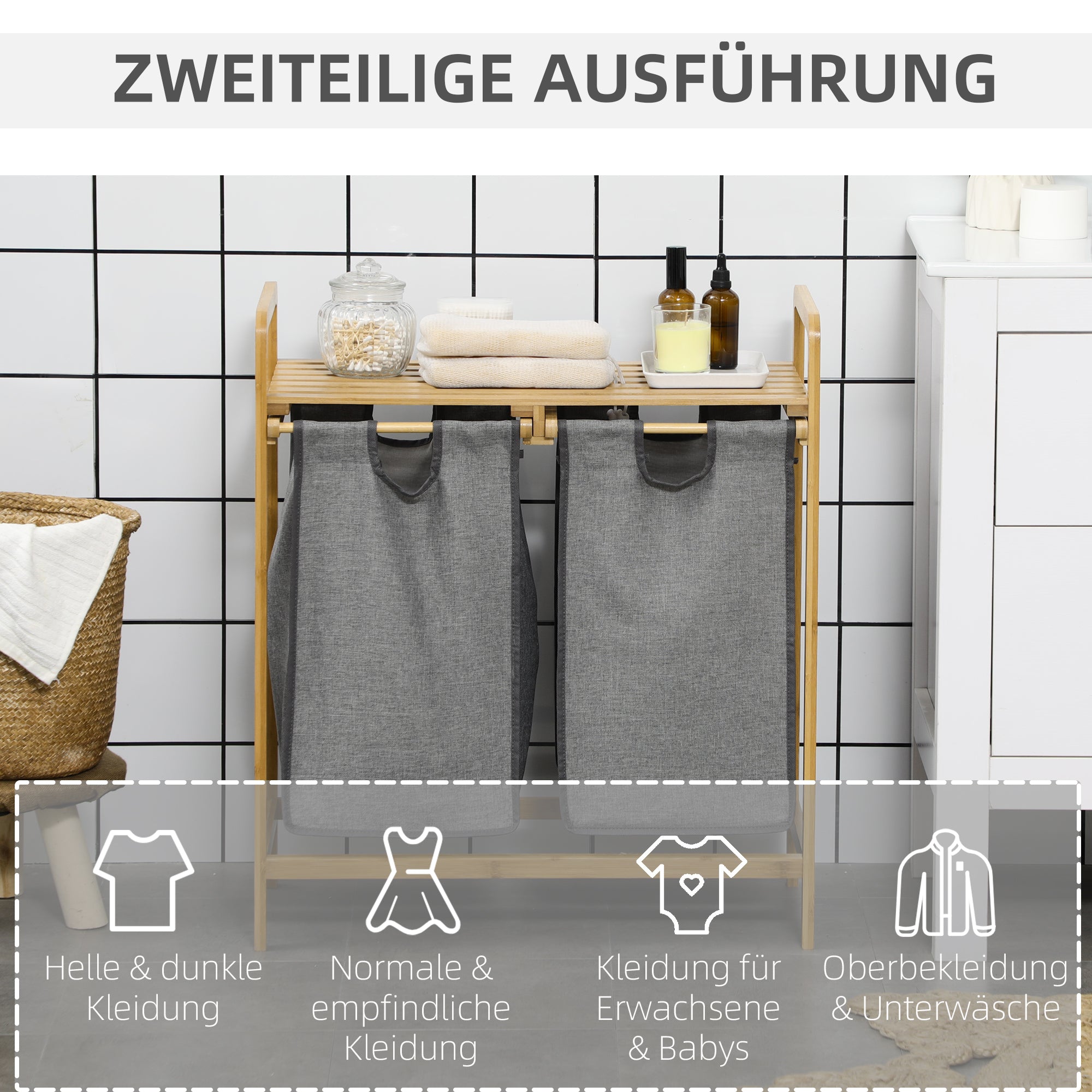 HOMCOM Wäschekorb aus Bambus mit 2 Fächern, Wäscheträger mit Griff, 2 abnehmbaren Wäschetaschen, Ablage, Wäschebox zum Sortieren für Schlafzimmer, Bad und Wäschezimmer in Natur und Grau