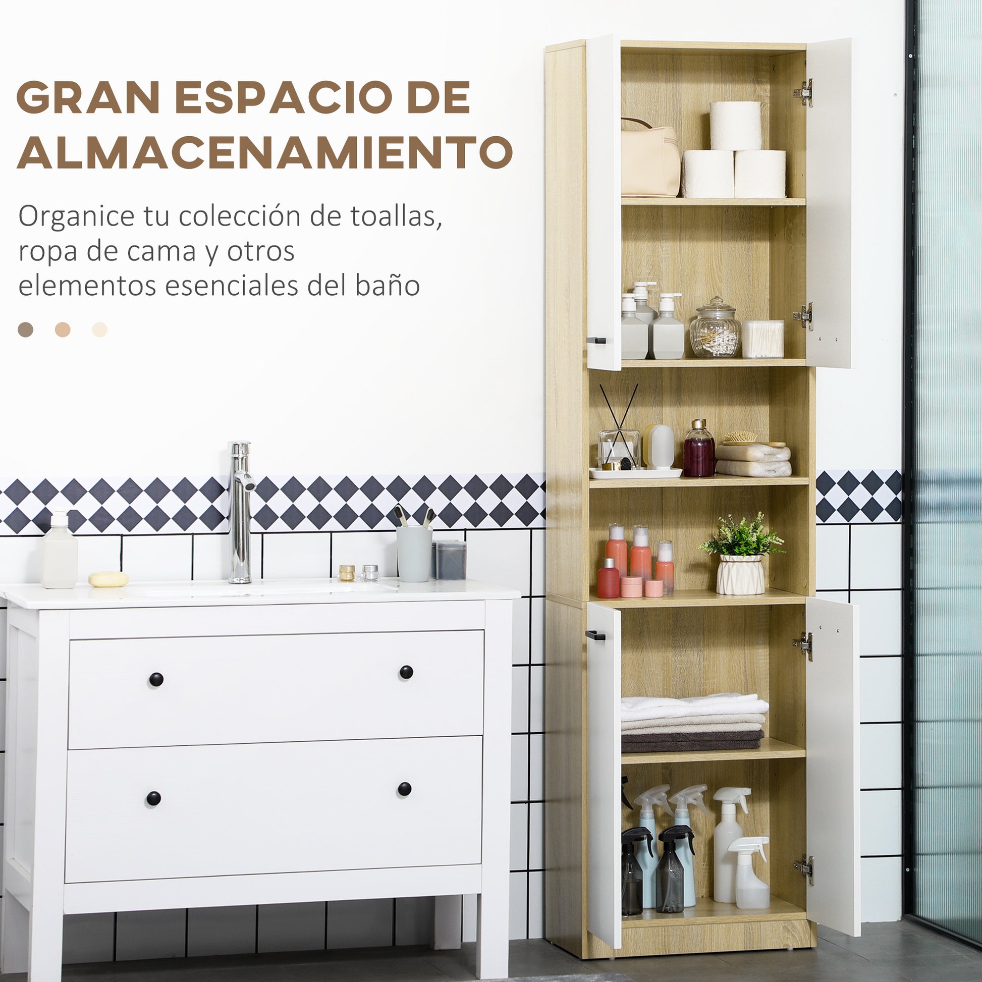 - - VIEL PLATZ VERFÜGBAR: Im Badezimmer scheint es nie genug Platz für alles zu geben, was man braucht. Dieser Badezimmer-Säulenschrank ist mit 2 hohen Schränken mit Türen und 2 offenen Regalen ausgestattet, die es Ihnen ermöglichen, Handtücher, tägliche Hygieneartikel und Reinigungsmittel zu verstauen, ohne sich um den Platz Sorgen machen zu müssen.
