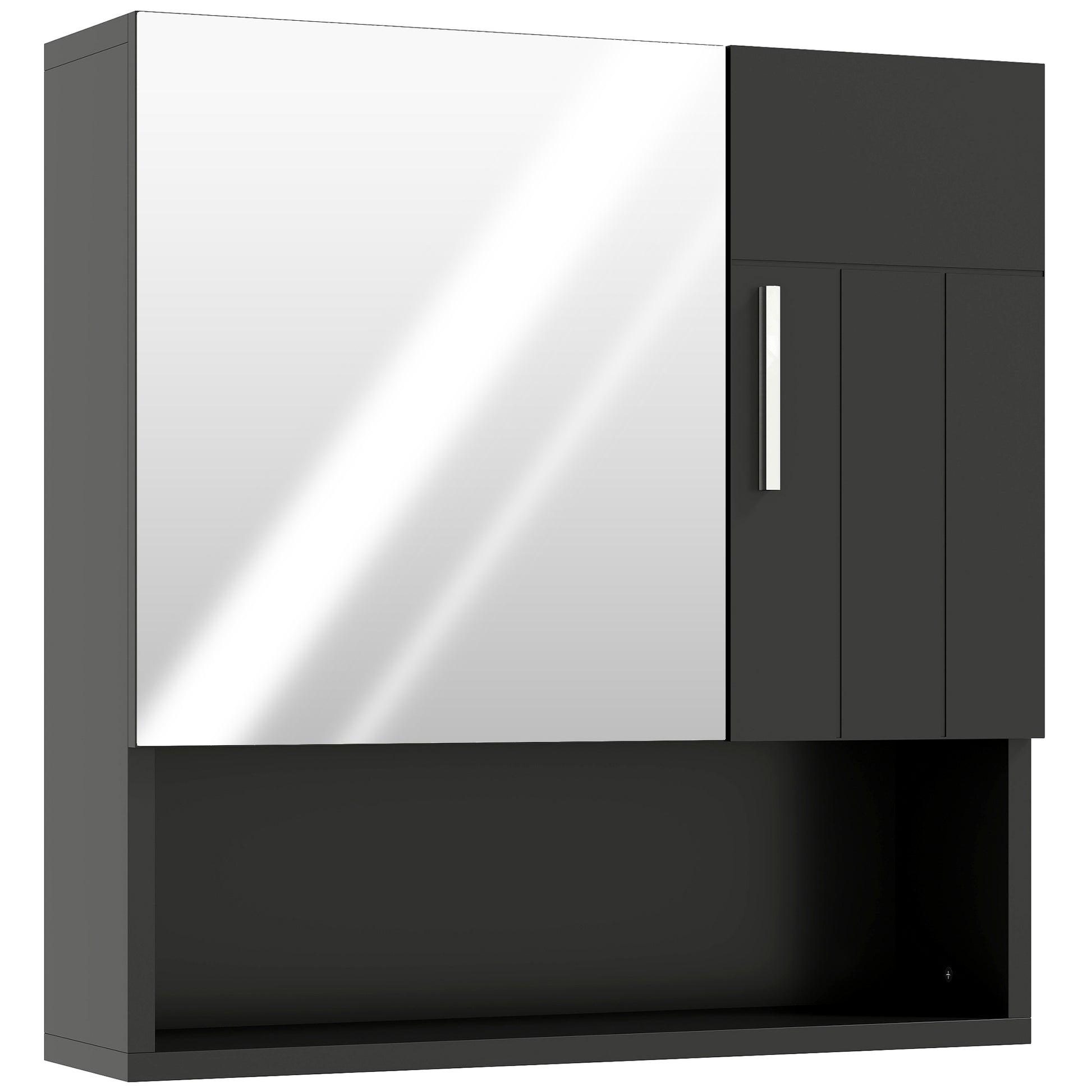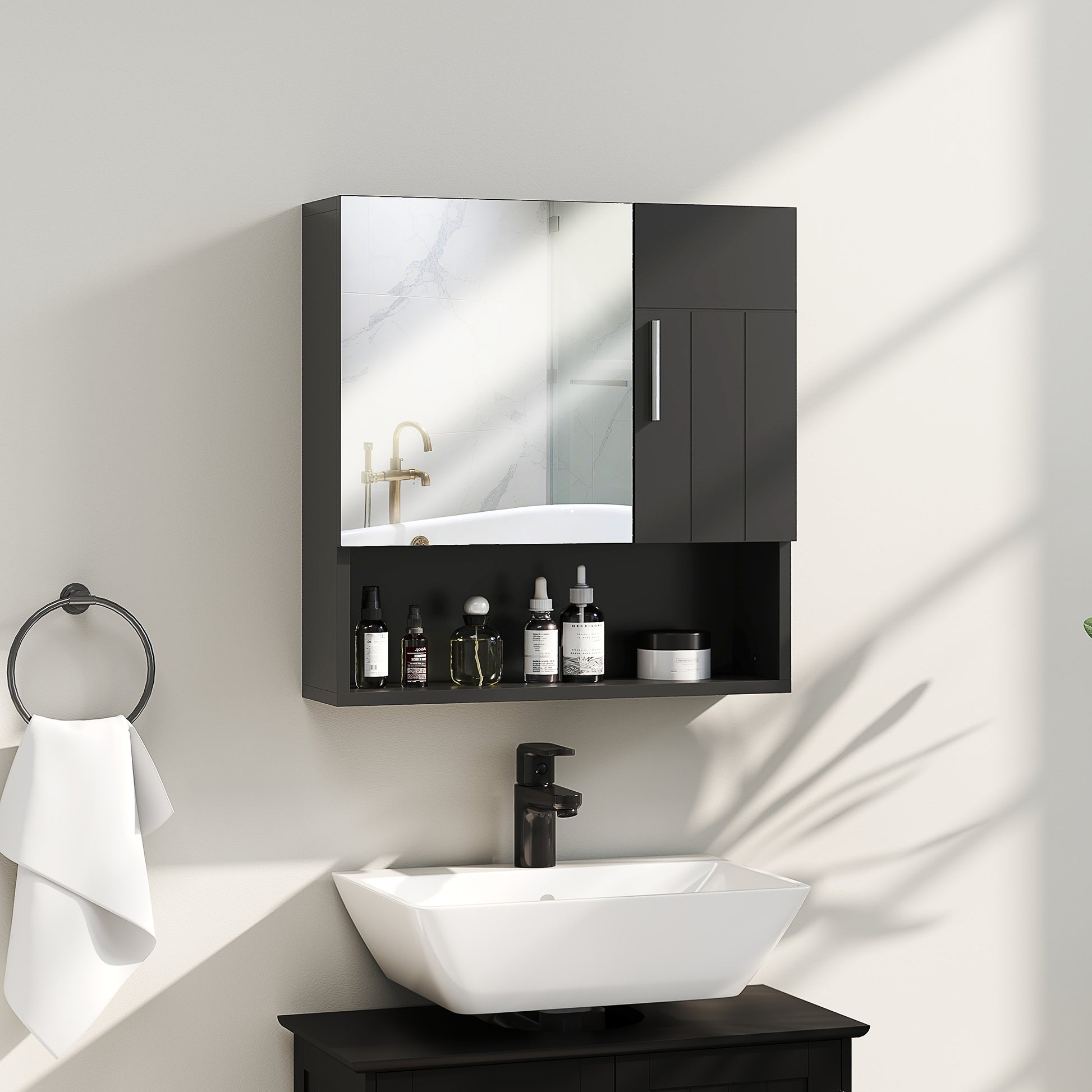 Kleankin Badspiegelschrank mit verstellbaren Regalen, 2-türiger Badspiegelschrank mit offener Ablage aus Holz und Glas, 54x15,2x55,3 cm, Schwarz