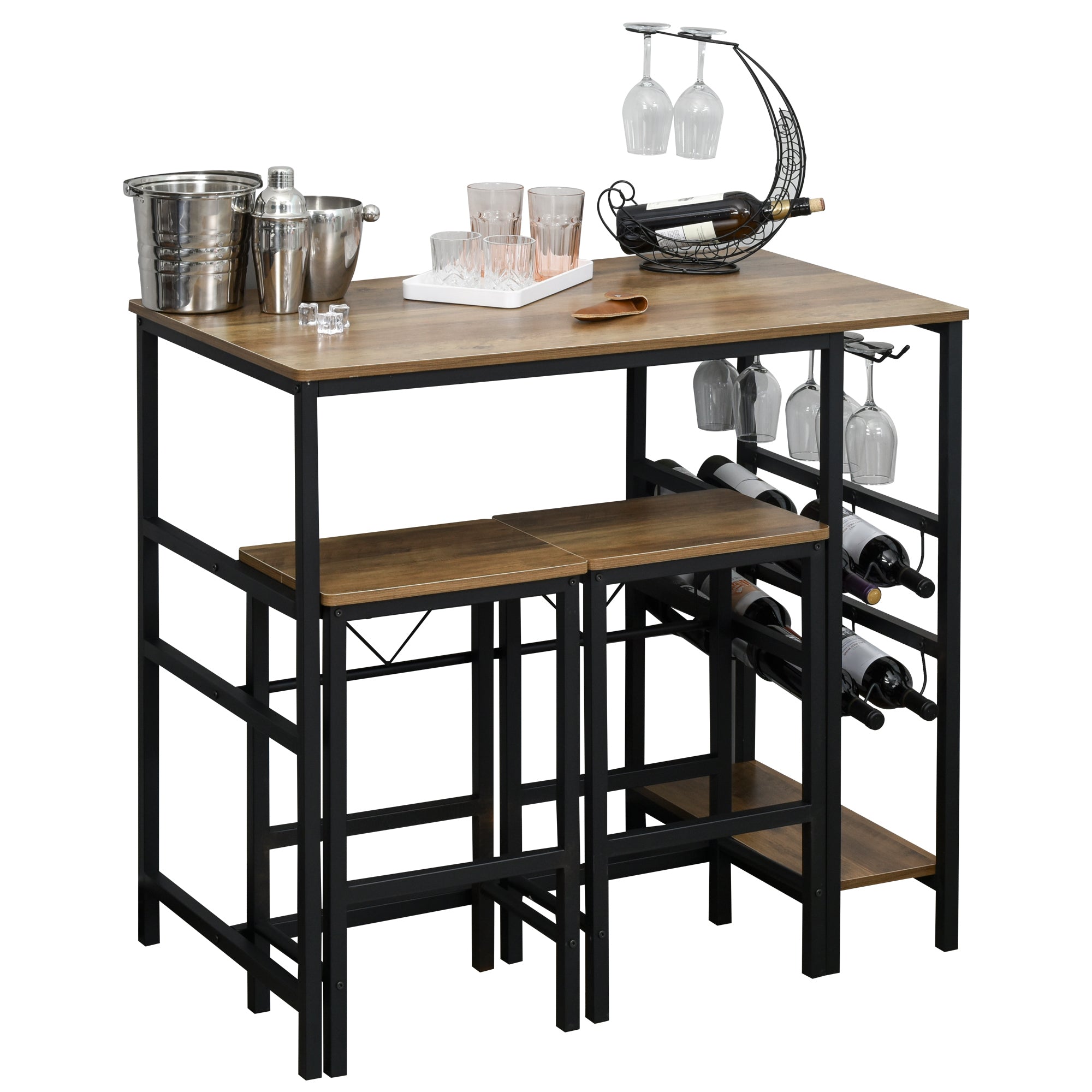 HOMCOM Bartisch-Set, Hoher Tisch mit 2 Barhockern, 3-teiliges Tischset für die Küche mit Flaschenhalter, Spanplatte, Stahl, Natur+Schwarz, 108 x 60 x 95H cm
