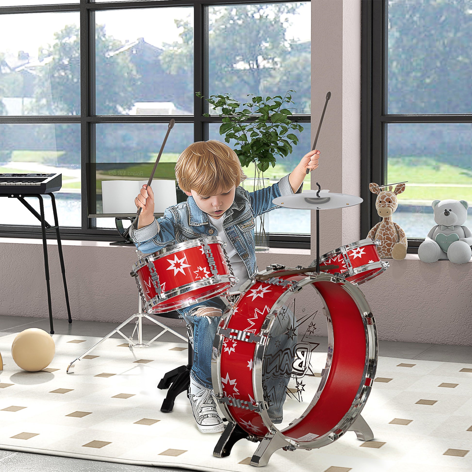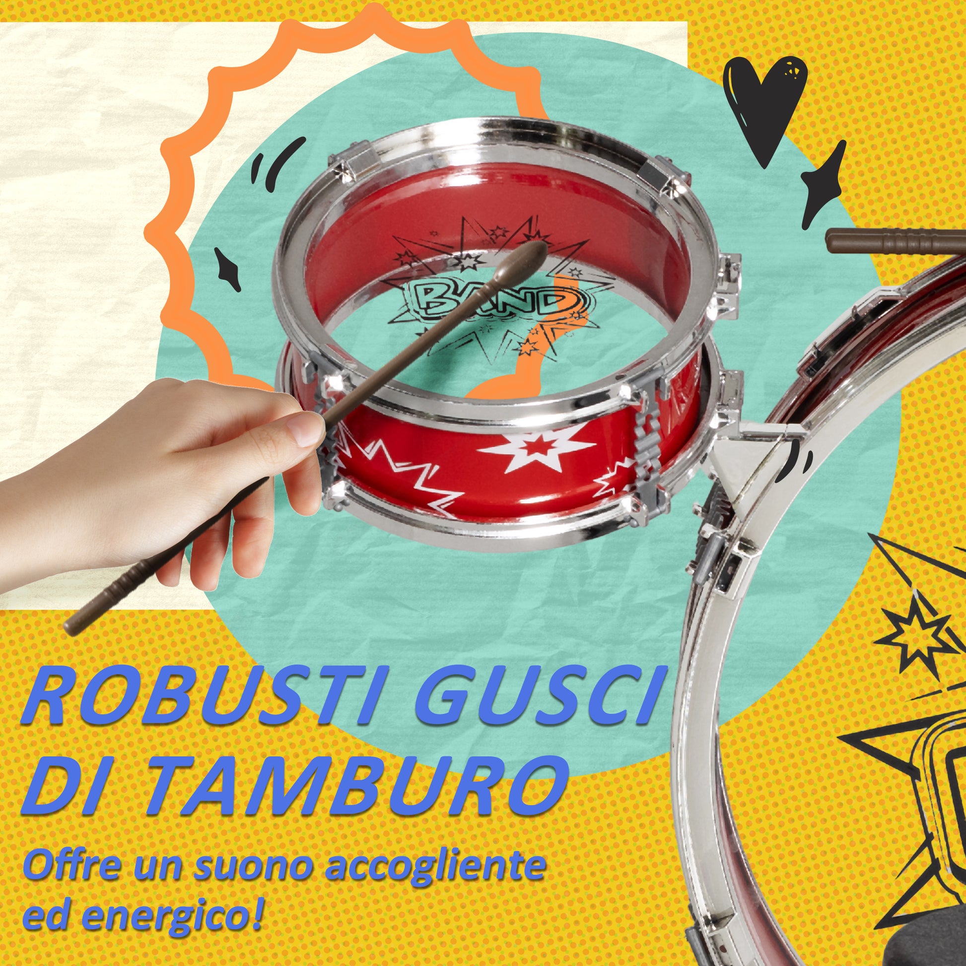 AIYAPLAY Kinder Schlagzeugset 3-6 Jahre 7-teilig mit Hocker und Drumsticks, Musikalisches Spielzeug aus Kunststoff und Metall, 72x29x56 cm, Rot