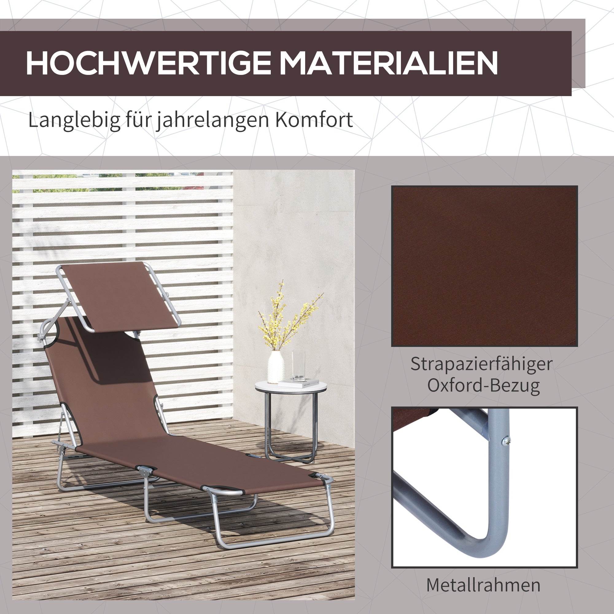 Outsunny Sonnenliege klappbar Gartenliege mit Sonnenschutz Liegestuhl mit 4-Fach verstellbare Rückenlehne Campingliege bis 120kg belastbar für Garten, Balkon und Pool geeignet, 6 Farben(Braun )