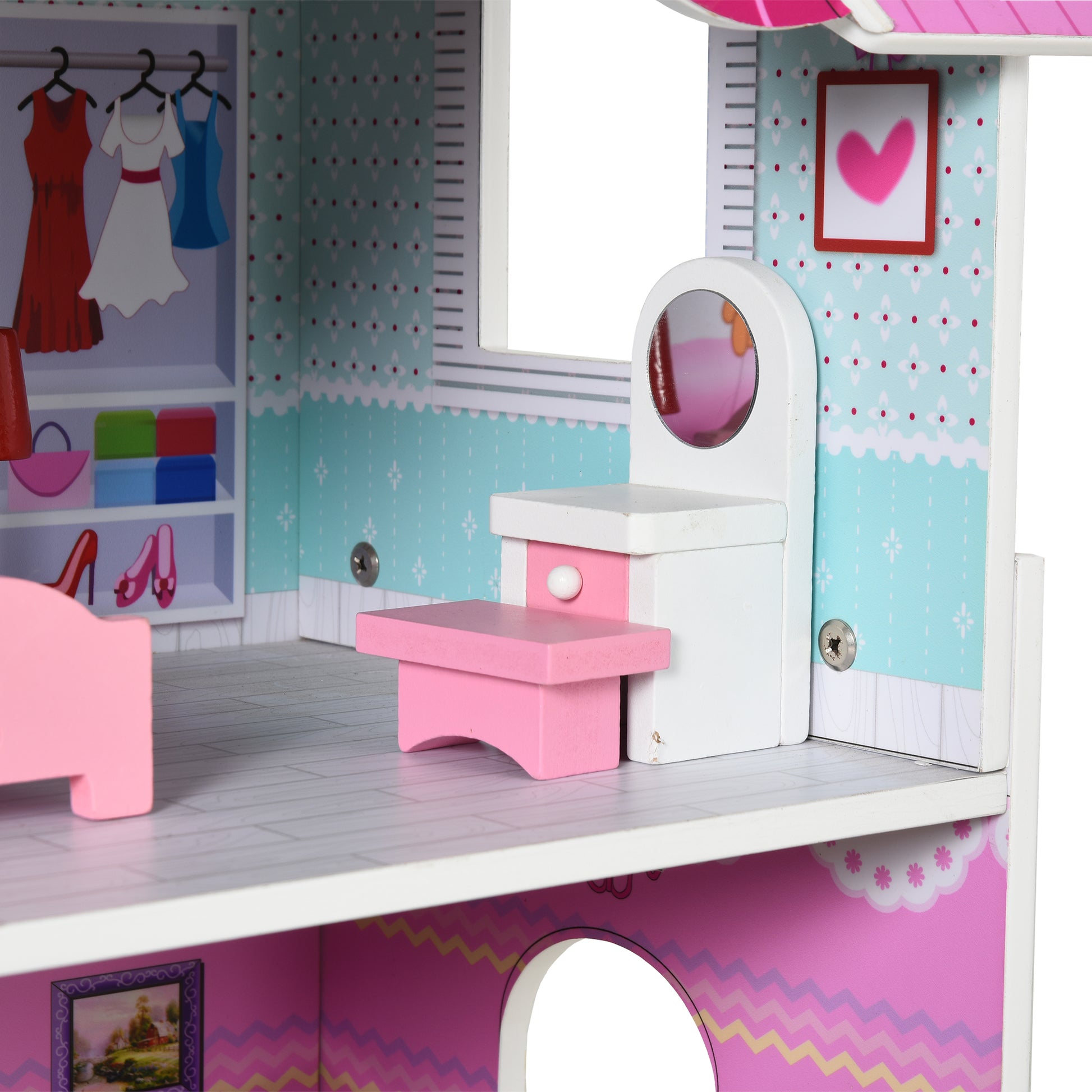 HOMCOM 3-stöckiges Holzpuppenhaus mit Terrasse 86x30x87 cm 13-teiliges Möbel- und Zubehörset mit niedlichem Design