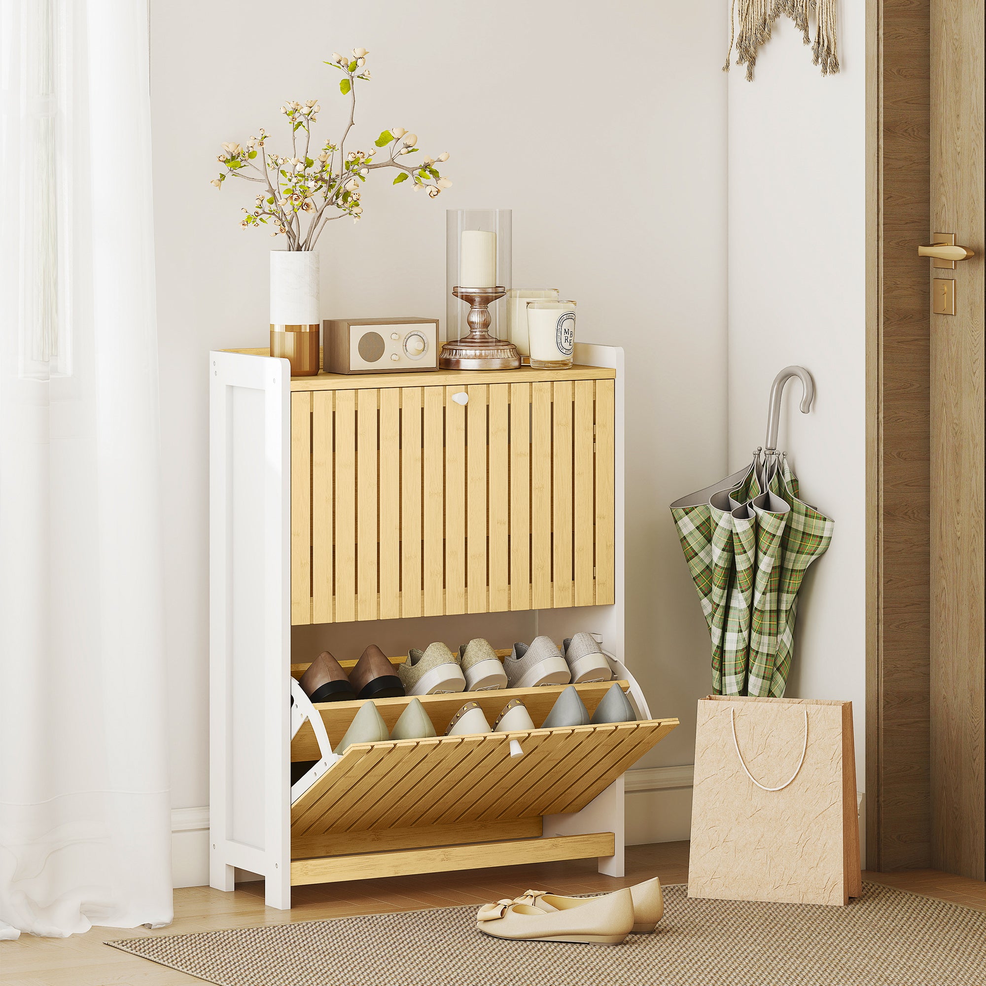 HOMCOM Schmaler Schuhschrank mit 2 Bambustüren und verstellbaren Regalen für 12 Paar Schuhe 60x24x82,5 cm Weiß und Natur