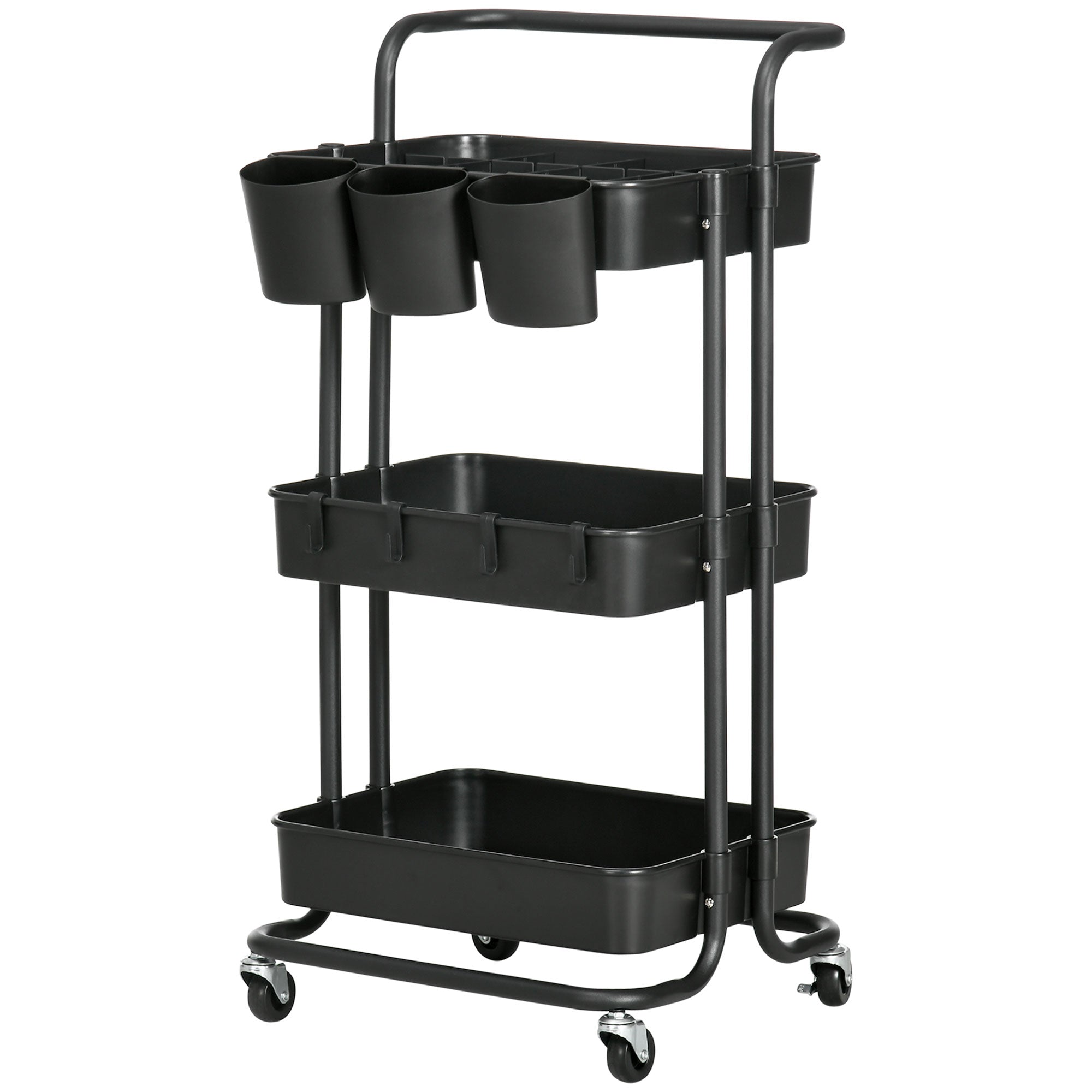 HOMCOM 3-stufiges Servierwagen mit Griff, fahrbarer Küchenwagen mit Haken und Aufbewahrungskörben, multifunktionaler Wagen für Küche, Büro, Bad, Schwarz