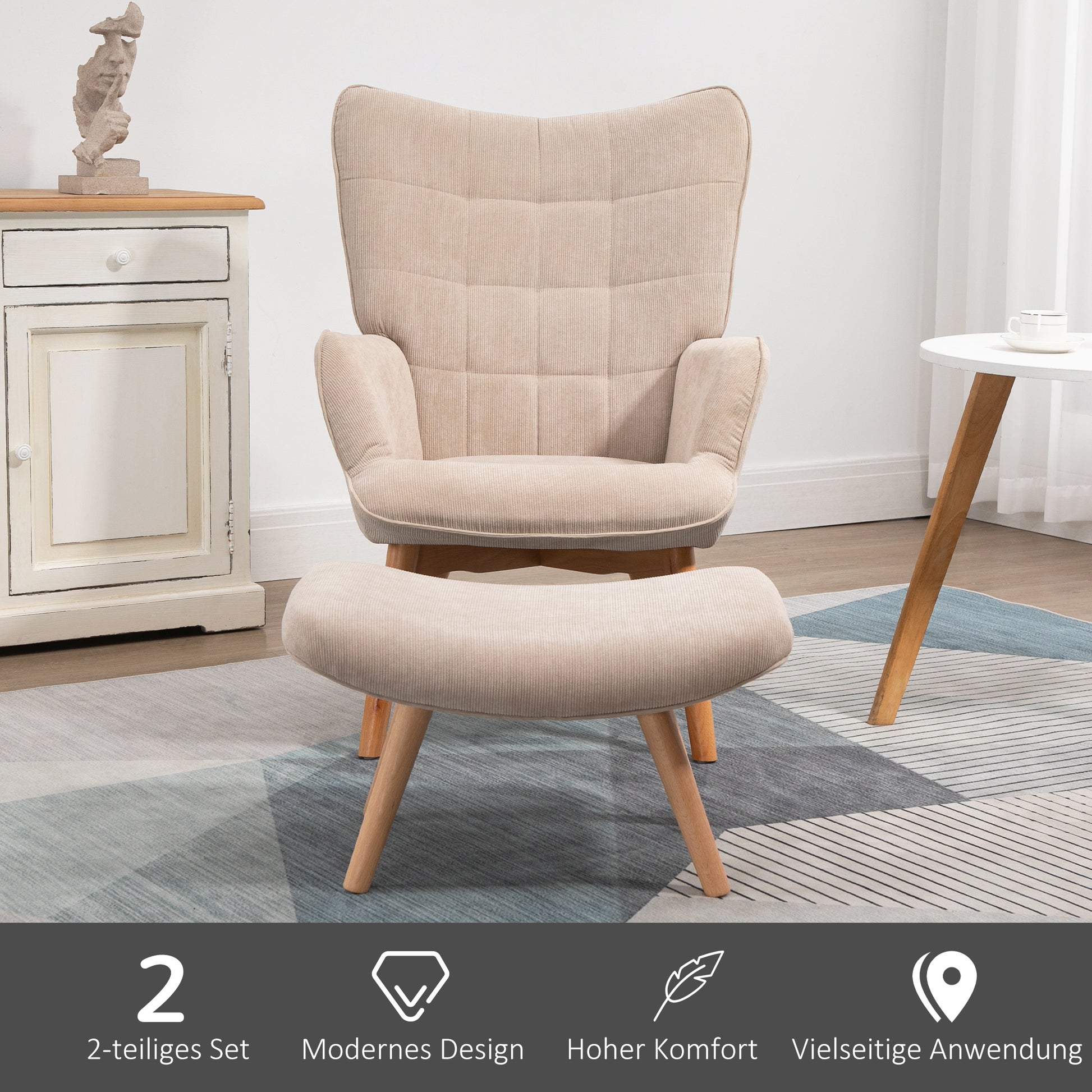 HOMCOM Sessel mit Hocker, Ohrensessel mit Hoher Rückenlehne, Holzbeine, Loungesessel mit getuftetem Design, Cord-Optik, für Wohnzimmer, Beige