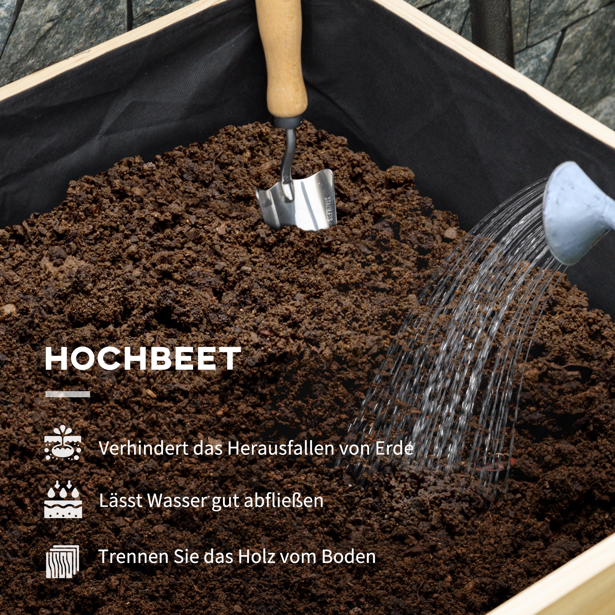 - - Beetverkleidung: Ausgestattet mit einer hochwertigen Vliesverkleidung, verhindert dieses Hochbeet das Austreten von Erde und leitet überschüssiges Wasser effizient ab. Es bildet zudem eine schützende Barriere zwischen dem Holzgrund und der Pflanzenerde, die dem Beet hilft, in einem hervorragenden Zustand zu bleiben.