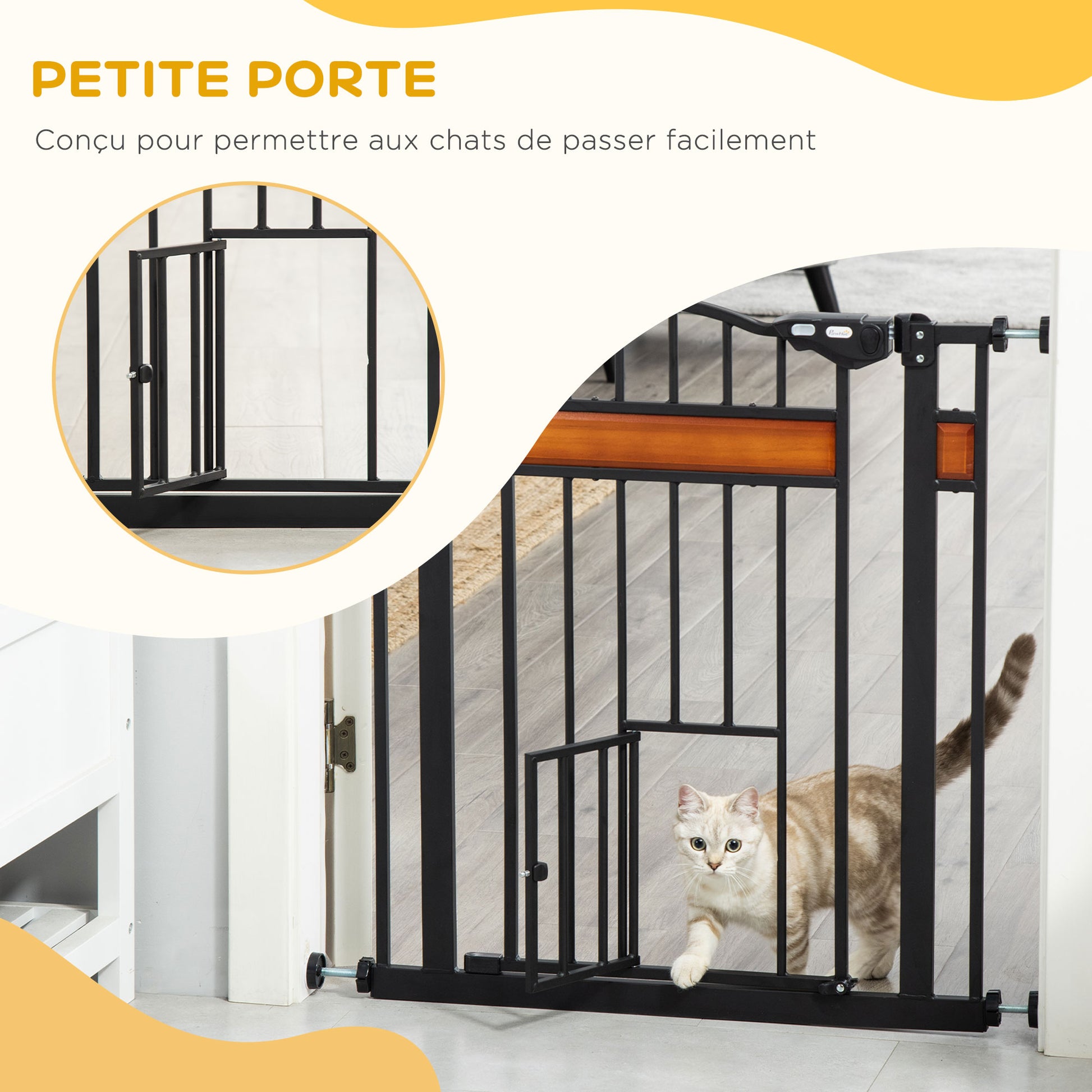 PawHut Haustiersicherheitsbarriere mit automatischer Schließtür und Doppelverriegelungssystem – Bohrfrei von 74 bis 80 cm – Stahl und Kiefernholz – Schwarz