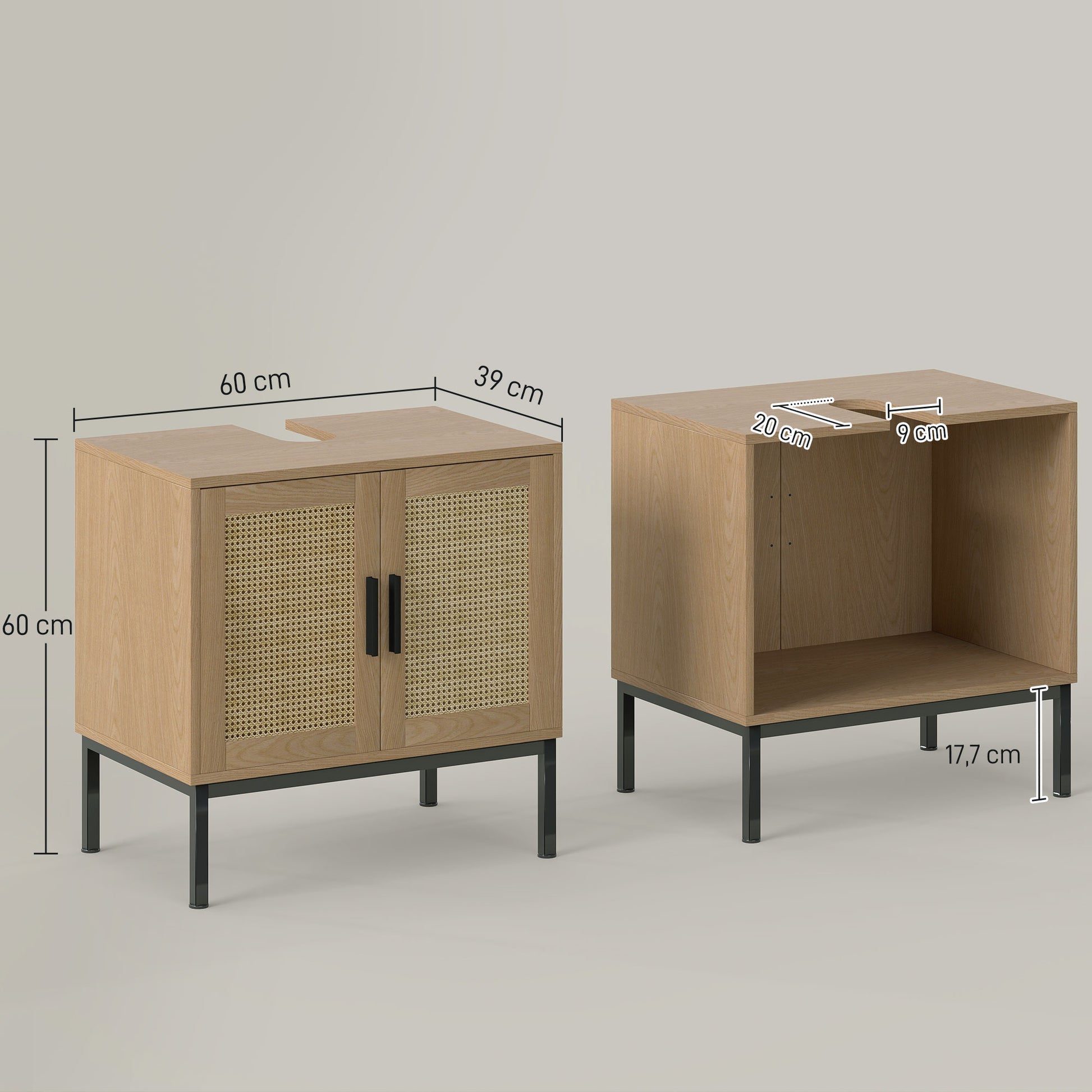 - - Στυλ Μποέμ: Ο συνδυασμός φυσικής ξυλόγευσης, πορτών ντουλάπας με στοιχεία ρατάν και μαύρων μεταλλικών ποδιών κάνει αυτή τη ντουλάπα μπάνιου μοναδική και κομψή ώστε να ταιριάζει σε διάφορες ρυθμίσεις.