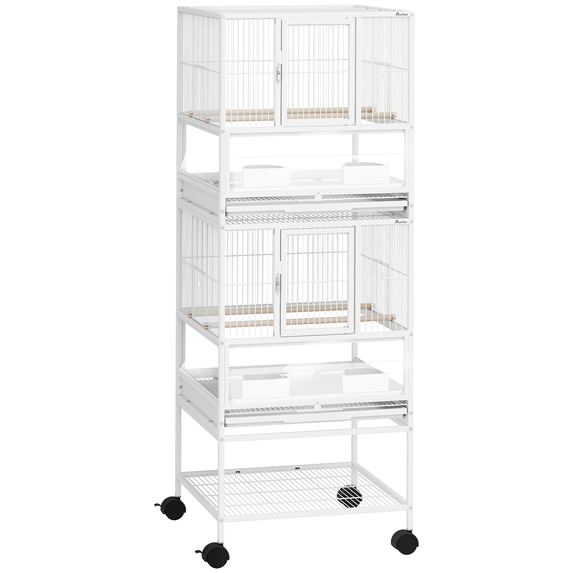 Κλουβί Πουλιών PawHut Μεγάλο 2 Επίπεδα με Ρόδες Ακρυλικά Πλαίσια Ταΐστρες Κορώνες Ράφι Αφαιρούμενα Δισκάκια Σπίτι Για Παπαγάλους Κανάρια 48x46x134,5 εκ Λευκό