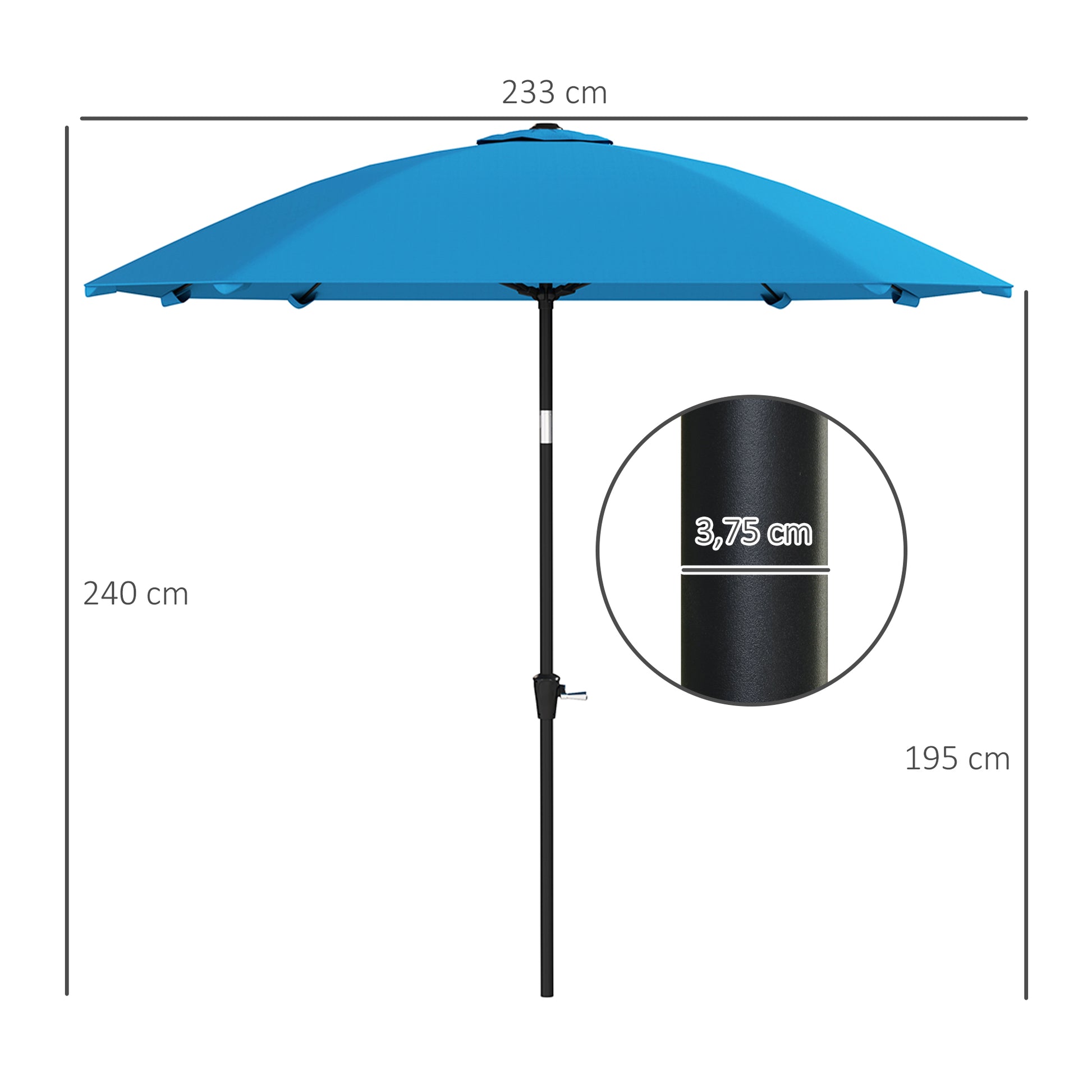 - - ΣΥΝΟΛΙΚΕΣ ΔΙΑΣΤΑΣΕΙΣ: 233x233x240 εκ. (ΜxΠxΥ). Σημείωση: Απαιτείται βάση 22 κιλών (δεν περιλαμβάνεται). Αποφύγετε τη χρήση της ομπρέλας σε ακραίες καιρικές συνθήκες, όπως ισχυρούς ανέμους, έντονη βροχή ή χιόνι.