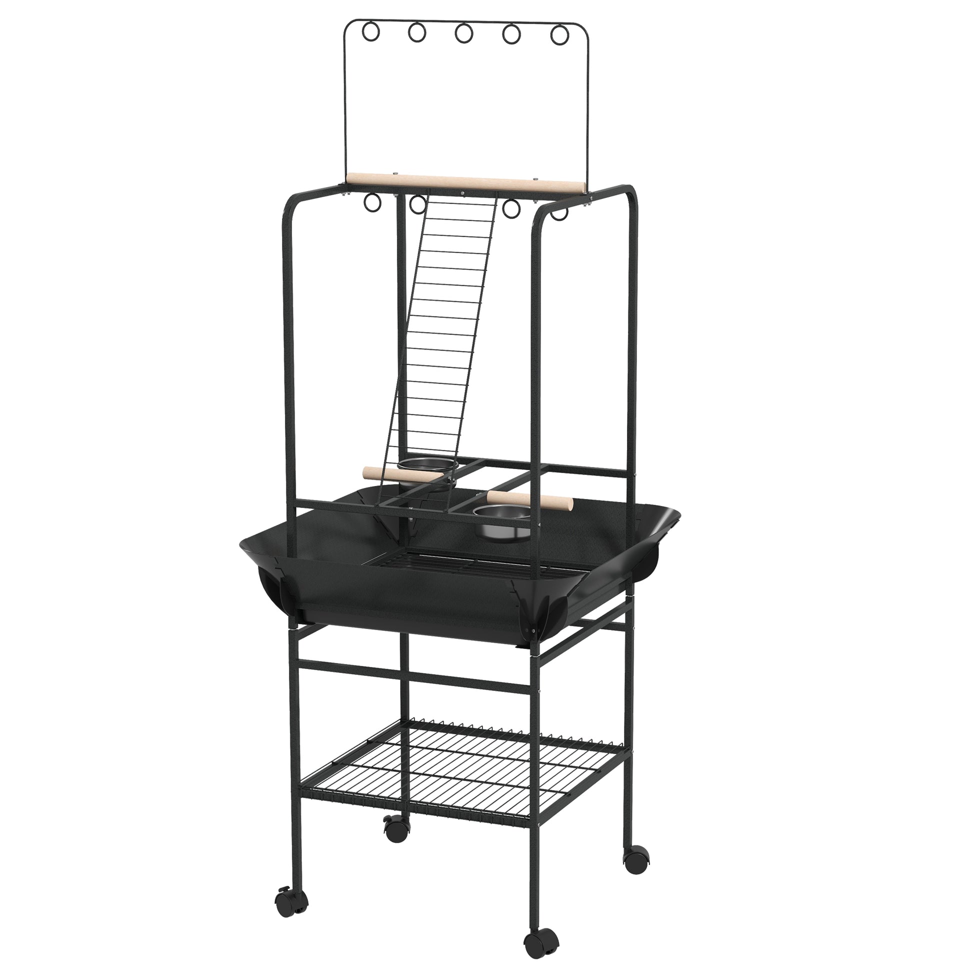 PawHut Κλουβί Παιχνιδιού Για Πουλιά σε Ρόδες Για Παπαγάλους με 3 Ξύλινες Κάθες, 1 Σκάλα, 2 Χάλκινες Τροφοδότριες, Αφαιρούμενη Ράγα Ανάκαμψης, 62,5 x 62,5 x 155 εκ, Σκοτεινό Γκρι