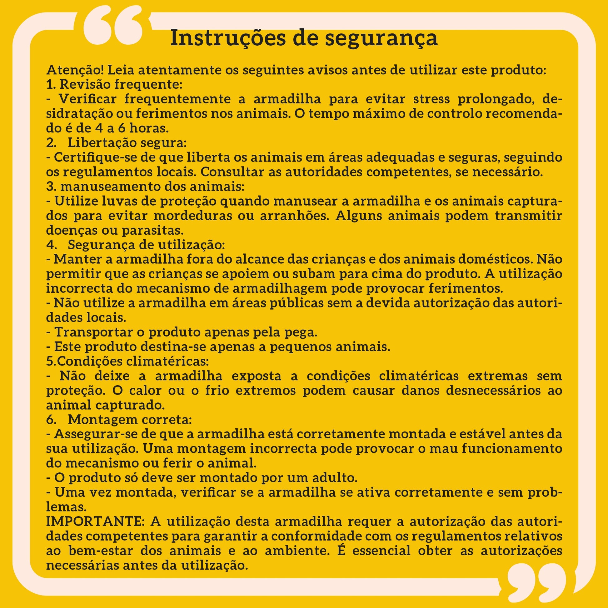 - - IMPORTANT: The use of this trap requires authorization from the competent authorities to ensure compliance with animal welfare and environmental regulations. It is essential to obtain the necessary permits before using it.