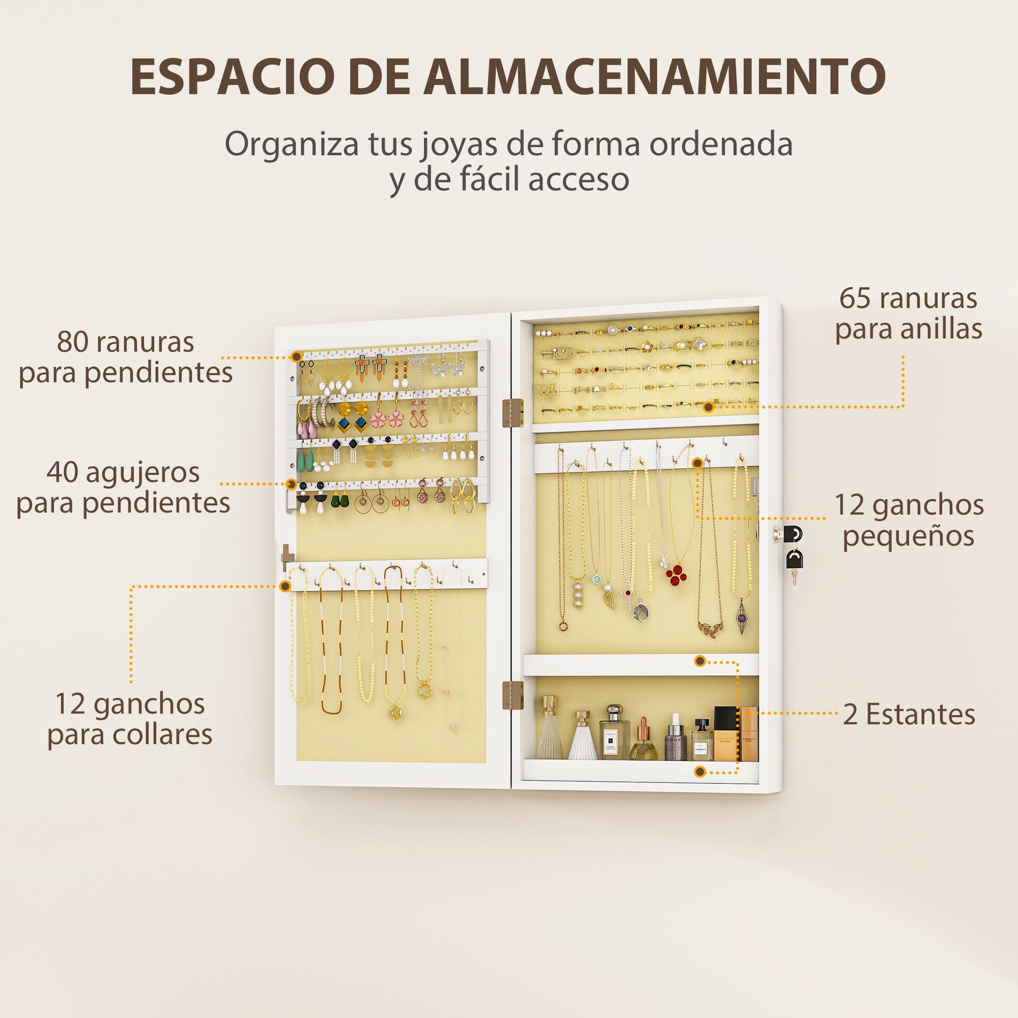 - - COMPLETE ORGANIZATION: This jewelry mirror has a very well-organized interior: 80 earring slots, 40 holes, 12 large hooks, 12 small hooks, 65 ring slots, and 2 shelves. Each item has its place, without tangles or chaos