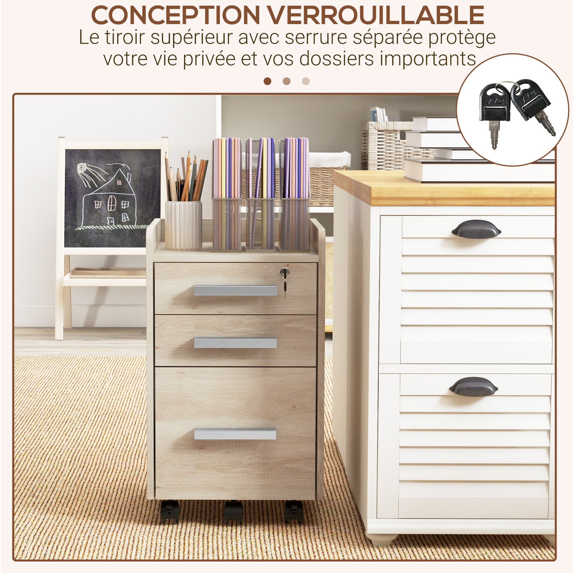 - - SLEEK AND MODERN DESIGN: beige office cabinet with black wheels. Ideal for creating an elegant and inspiring workspace. It will bring a distinctly modern and contemporary style to your room.