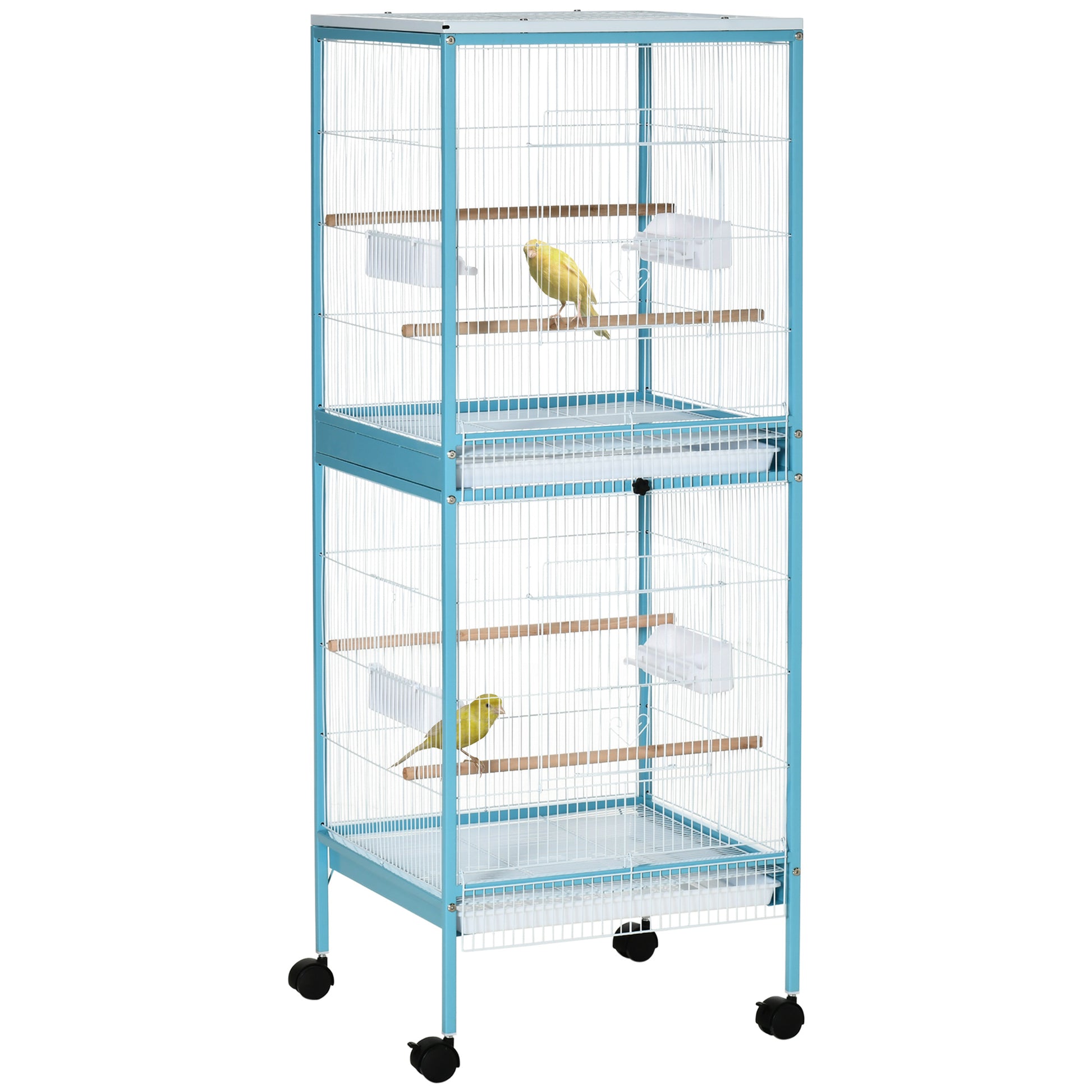 Bird Cage with Wheels Large 2-Level Aviary with Removable Trays Doors Feeders Perches for Canaries Budgies 51.5x50x140 cm Blue