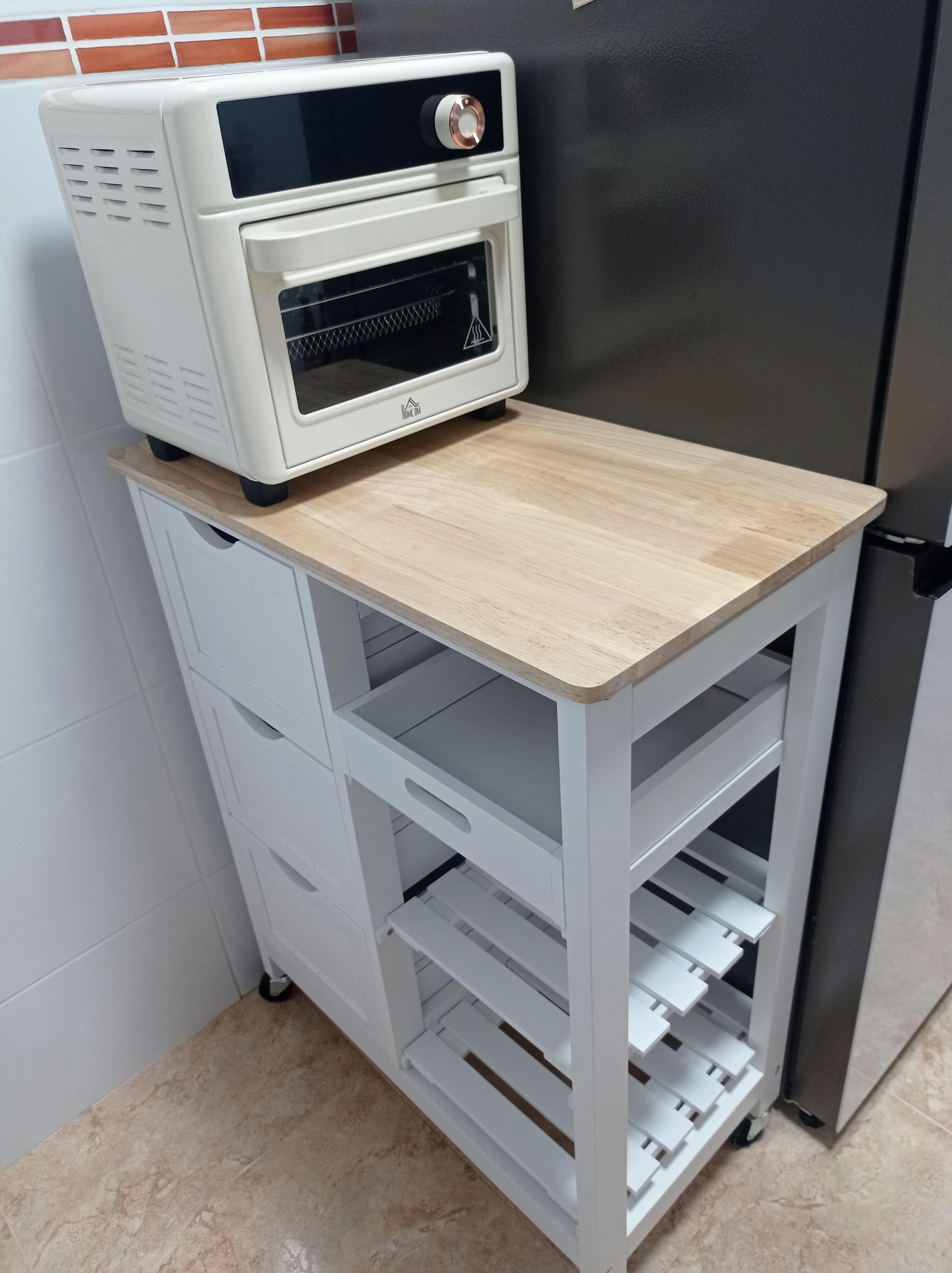 - - REMOVABLE TRAY AND SPACIOUS COUNTERTOP: The top shelf is a removable tray that you can use for serving. The rubber wood countertop adds extra space for food preparation or leaving dishes before serving