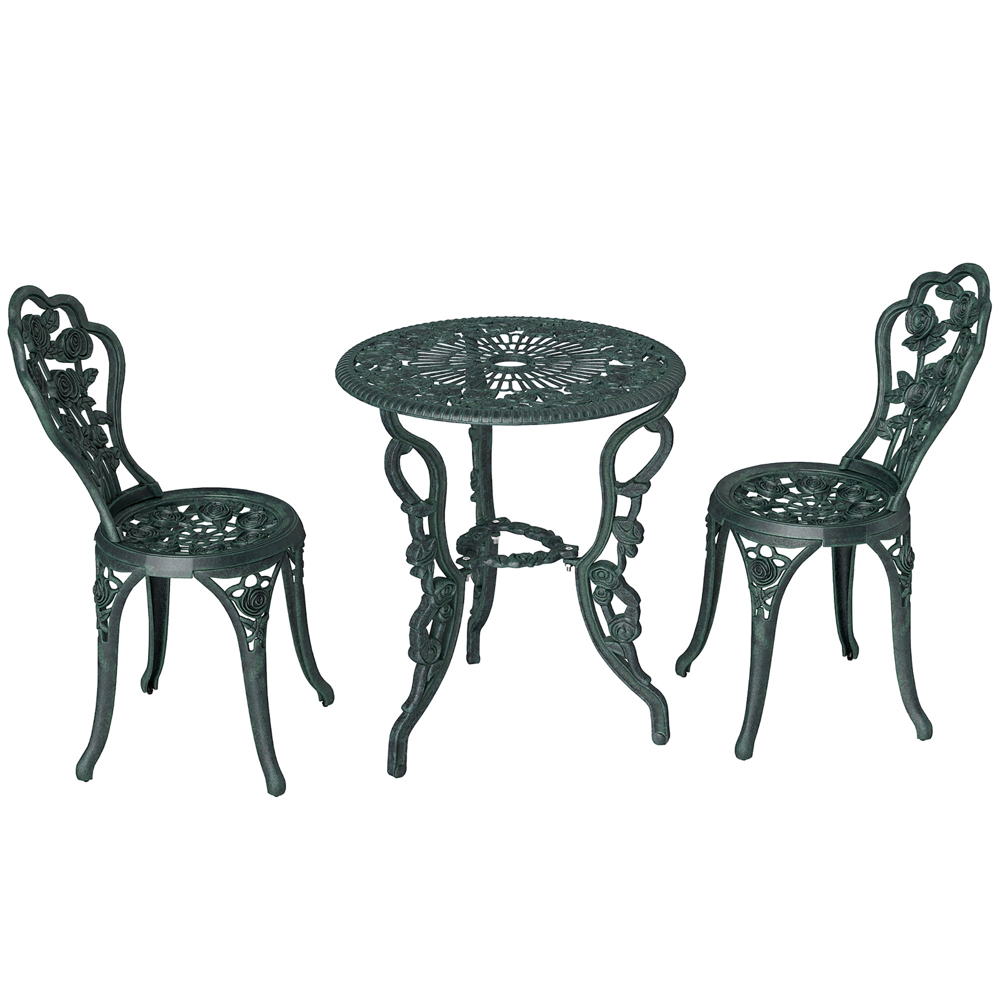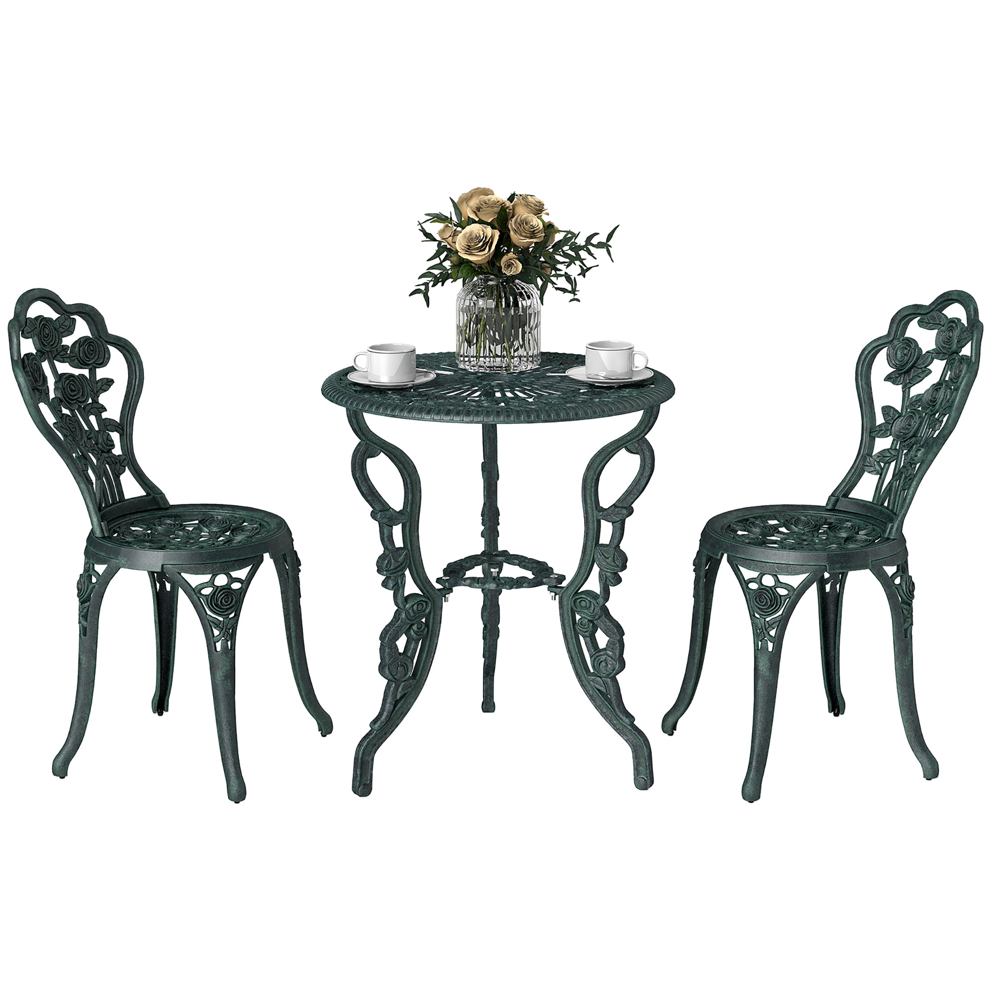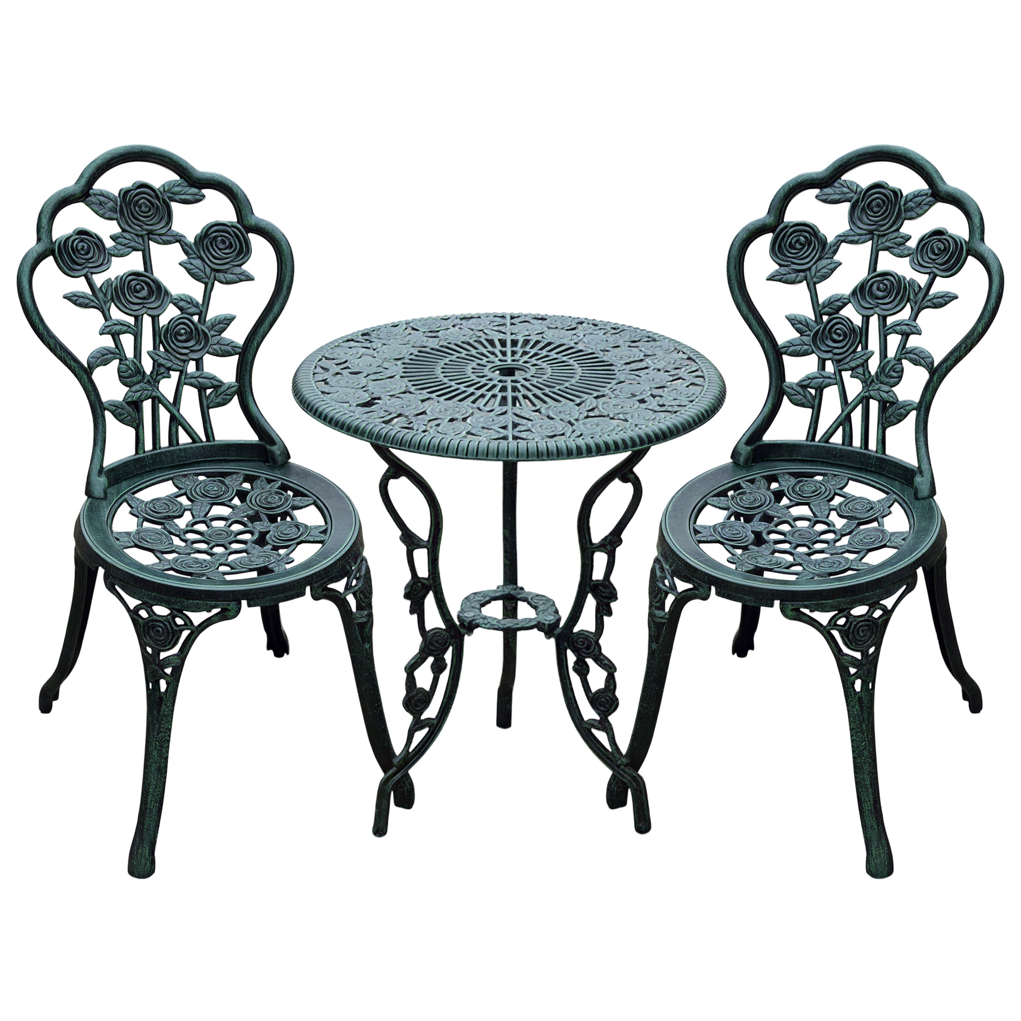2-Seater Garden Set, 2 Chairs + Round Table Neo-Retro Style Rose Pattern Sleek Lines Aluminum Antique Green