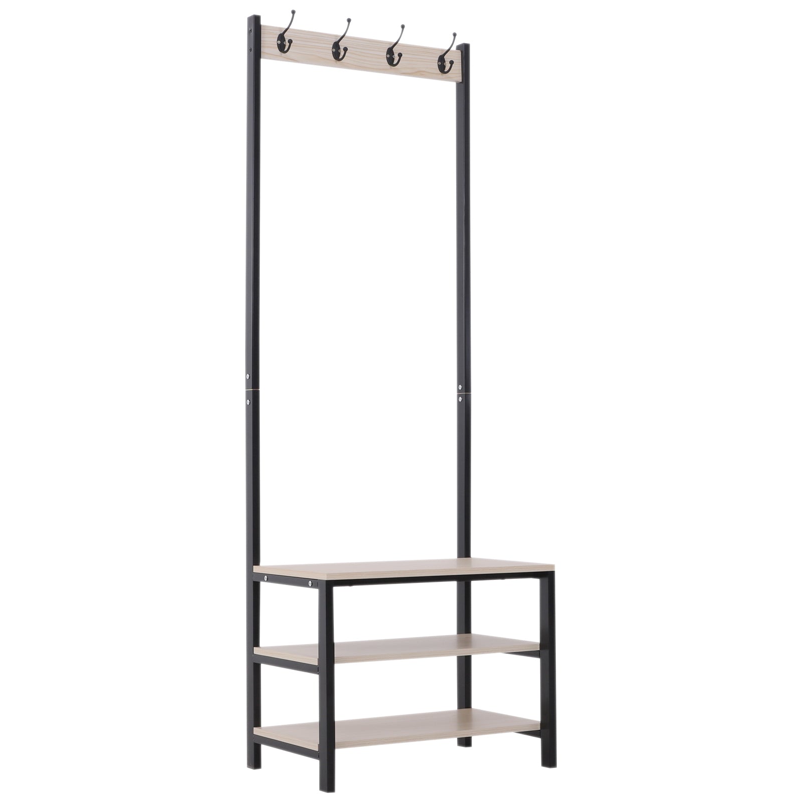 Coat Rack with Bench Metal Shoe Rack with 3 Shelves and 4 Hooks for Hanging Clothes for Hallway Entryway 60x40x175 cm Black and Natural