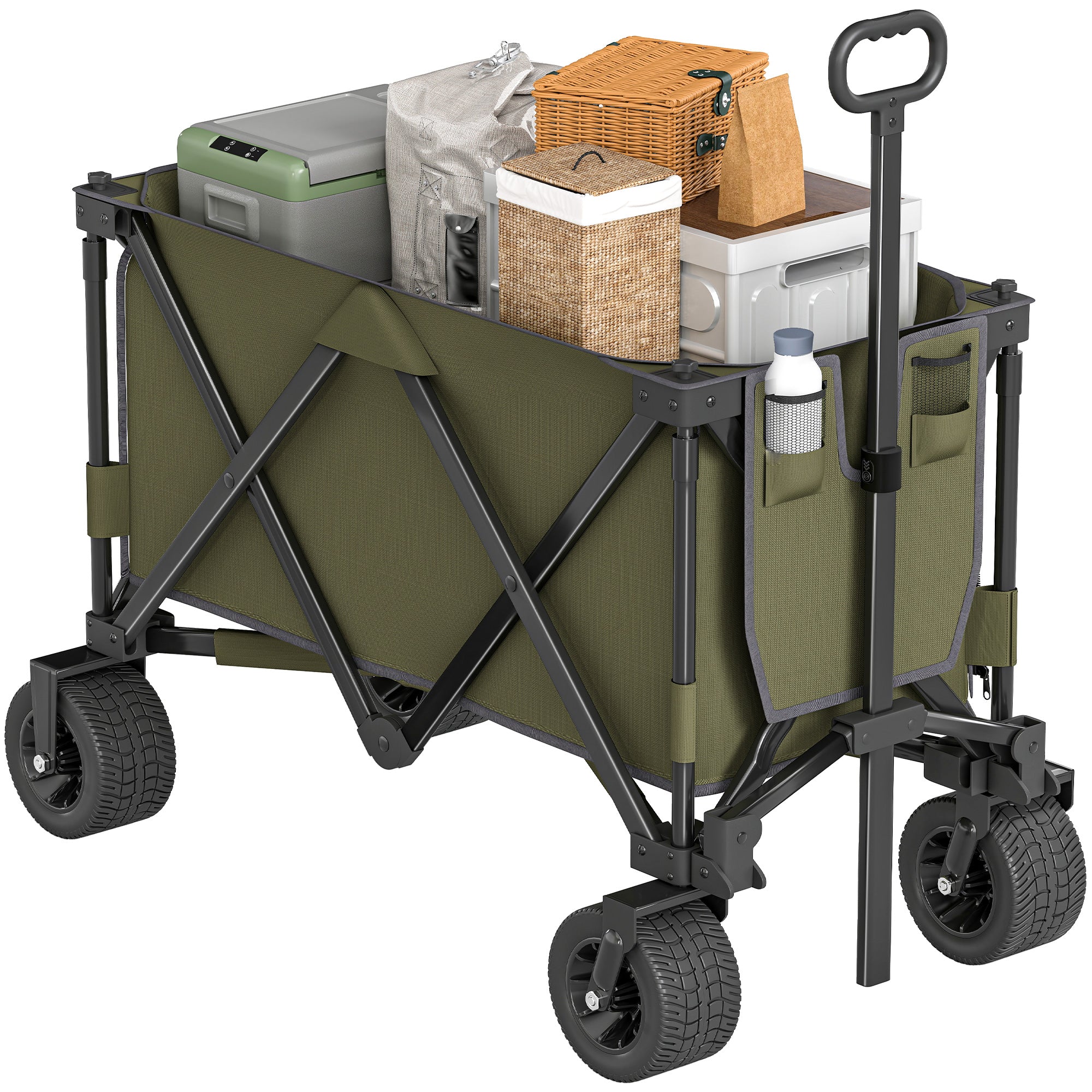 Folding Cart, Transport Wagon with Adjustable Handle, Beach Wagon with Pockets, Garden Cart with Wide Swivel Wheels, Supports up to 120 kg, Green