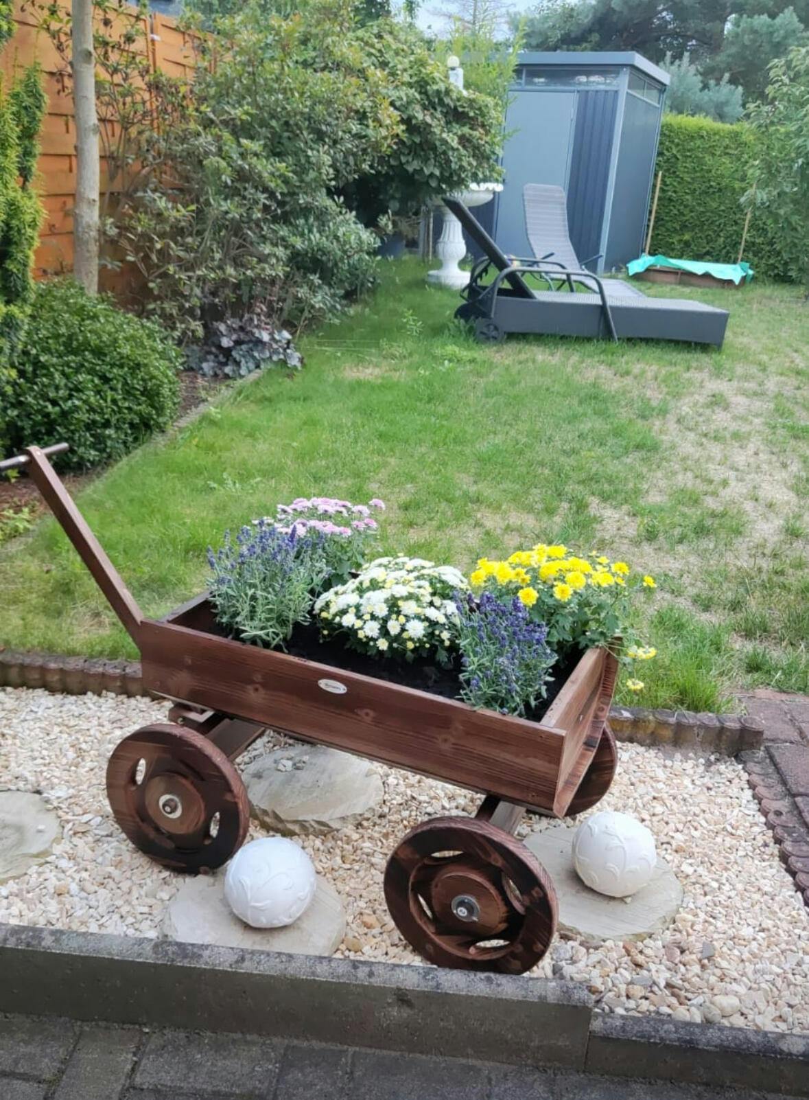 • - Wooden Cart: Easily move it from one place to another with its four wheels and long wooden handle.